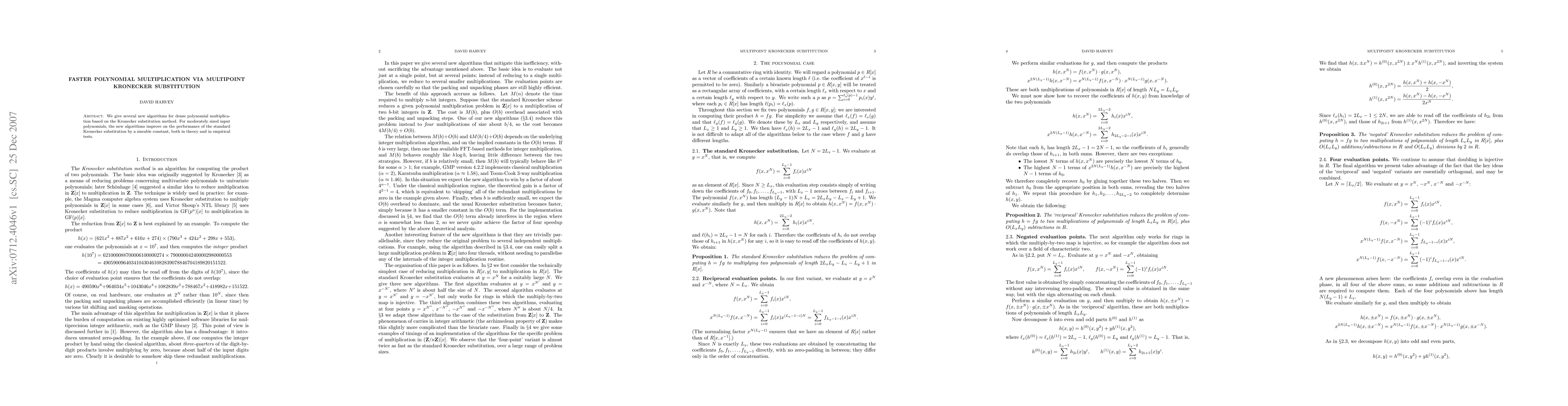 Title: Faster polynomial multiplication via multipoint Kronecker substitution Summary: New algorithms based on multipoint Kronecker substitution significantly outperform the standard method for moderately sized polynomials, showing notable improvements in both theoretical analysis and practical tests.