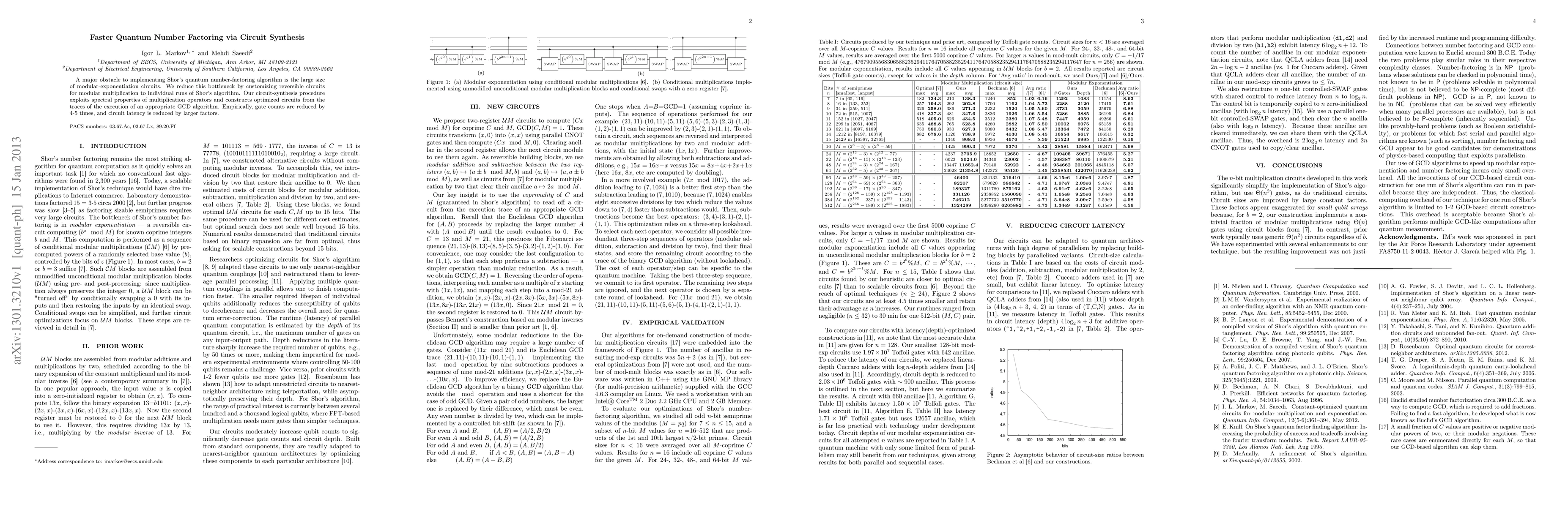 This paper presents a novel circuit-synthesis method to significantly reduce the size and latency of quantum circuits used in Shor's quantum number-factoring algorithm by customizing reversible modular multiplication circuits, leading to a 4-5 times reduction in gate counts and even greater reductions in circuit latency.