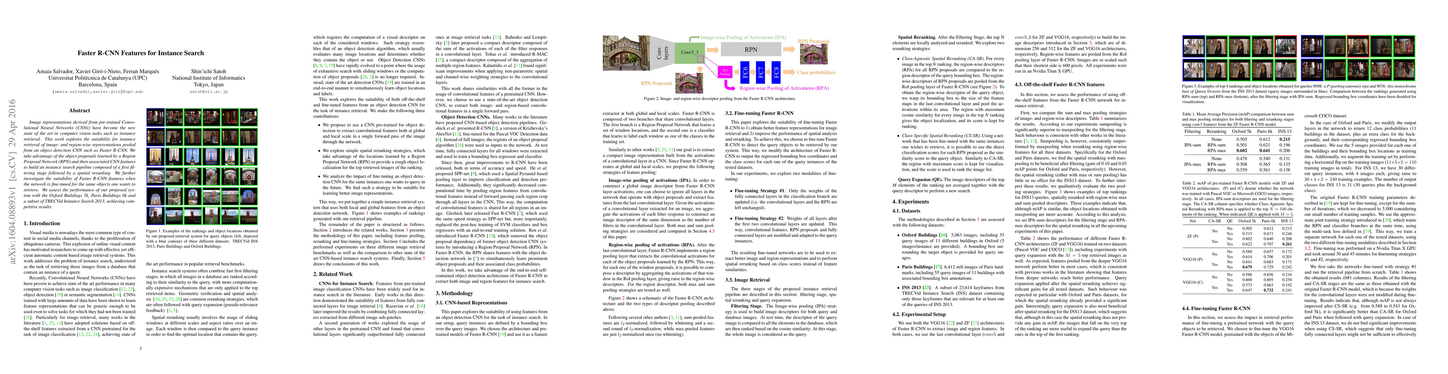 This paper investigates the use of Faster R-CNN features for instance search, leveraging region-wise CNN representations for efficient filtering and spatial reranking. Fine-tuning the network on target objects further enhances performance, achieving competitive results on multiple datasets.