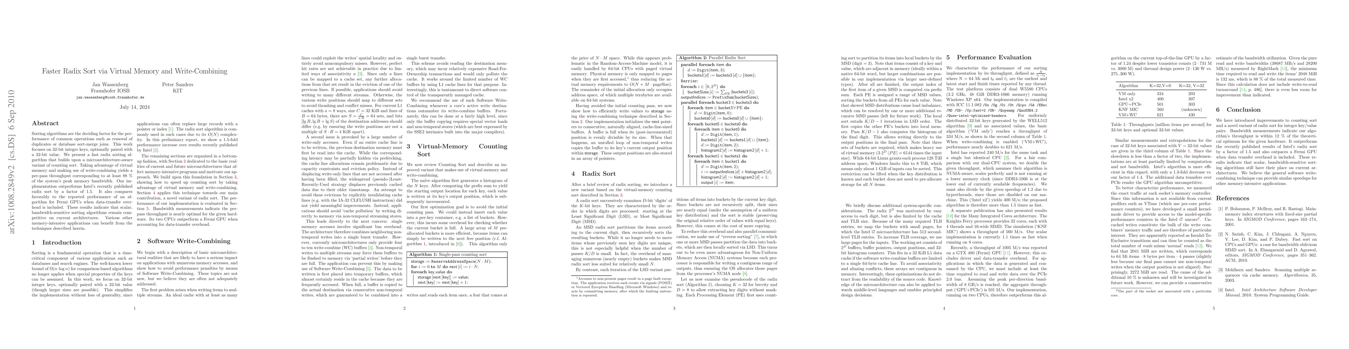 This paper presents a fast radix sorting algorithm for 32-bit integer keys that leverages virtual memory and write-combining to achieve high throughput, outperforming Intel's radix sort and GPU-based alternatives. The technique demonstrates that scalar, bandwidth-sensitive sorting algorithms remain competitive on modern architectures.