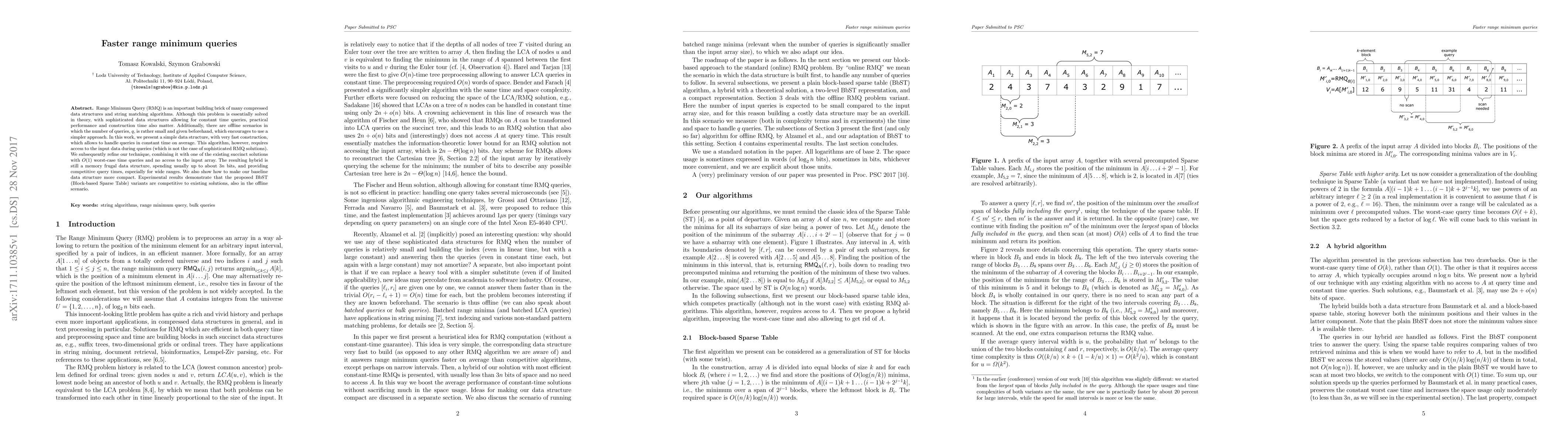 Range Minimum Query (RMQ) is an important building brick of many compressed data structures and string matching algorithms. Although this problem is essentially solved in theory, with sophisticated data structures allowing for constant time queries, practical performance and construction time also matter. Additionally, there are offline scenarios in which the number of queries, $q$, is rather small and given beforehand, which encourages to use a simpler approach. In this work, we present a simple data structure, with very fast construction, which allows to handle queries in constant time on average. This algorithm, however, requires access to the input data during queries (which is not the case of sophisticated RMQ solutions). We subsequently refine our technique, combining it with one of the existing succinct solutions with $O(1)$ worst-case time queries and no access to the input array. The resulting hybrid is still a memory frugal data structure, spending usually up to about $3n$ bits, and providing competitive query times, especially for wide ranges. We also show how to make our baseline data structure more compact. Experimental results demonstrate that the proposed BbST (Block-based Sparse Table) variants are competitive to existing solutions, also in the offline scenario.