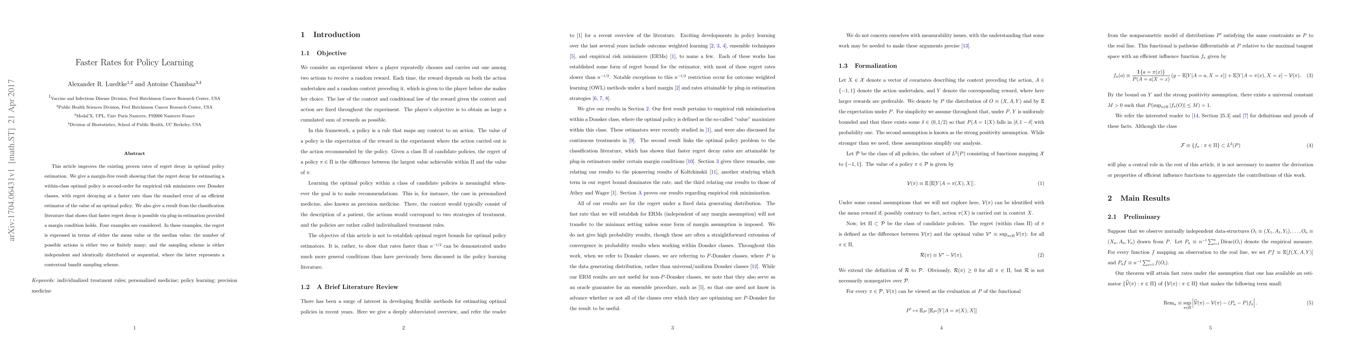 This paper improves proven rates of regret decay in optimal policy estimation, showing that regret can decay at a faster rate than the standard error of an efficient estimator, particularly via plug-in estimation under certain margin conditions.