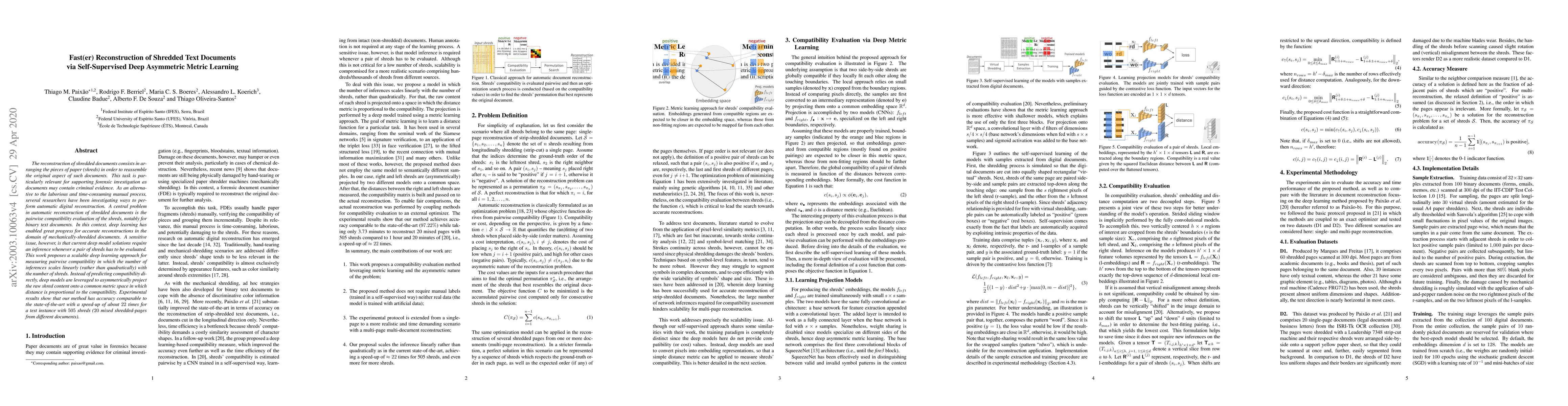 This paper proposes a scalable deep learning method for faster reconstruction of shredded documents using self-supervised asymmetric metric learning, reducing inference scaling from quadratic to linear. The method projects shreds into a common metric space, achieving state-of-the-art accuracy with a 22x speed-up for large datasets.
