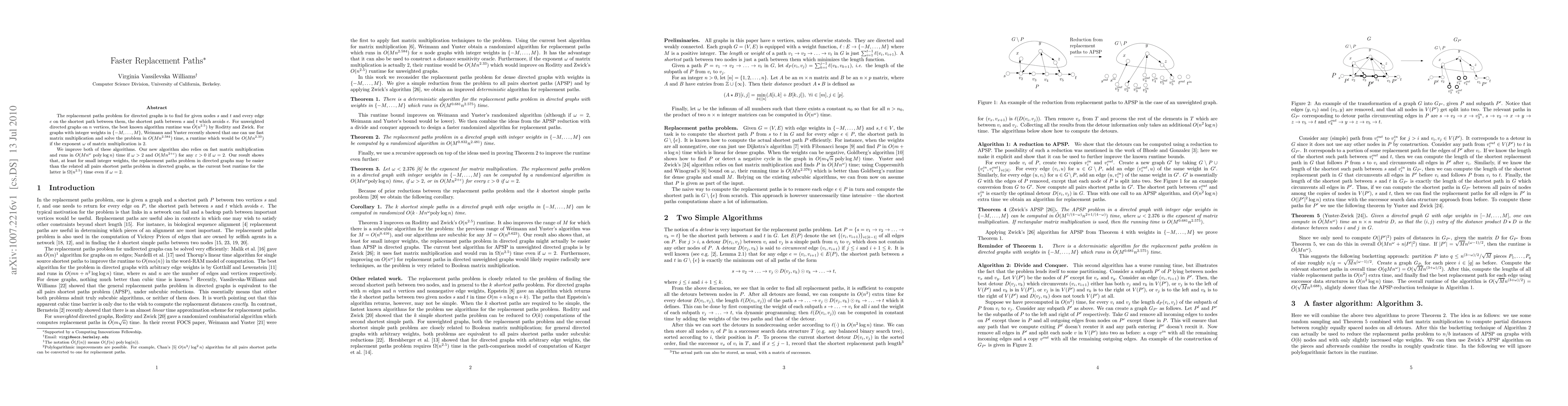 This paper presents an improved algorithm for solving the replacement paths problem in directed graphs, achieving a runtime of O(M n^ω polylog(n)) for ω > 2 and O(n^(2+ε)) for any ε > 0 when ω = 2, demonstrating that the problem may be easier than the all pairs shortest paths problem for small integer weights.