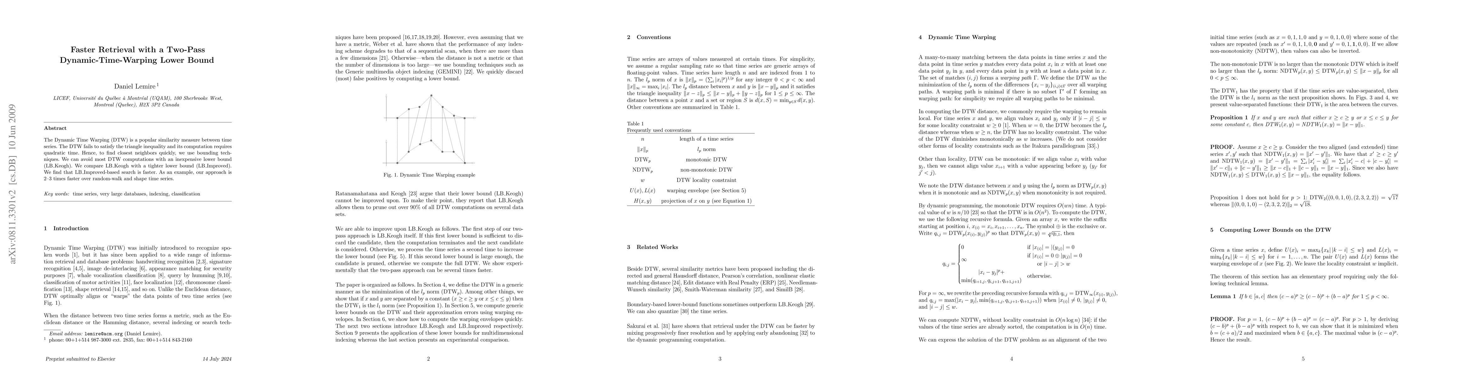 This paper proposes a faster retrieval method using a tighter lower bound for Dynamic Time Warping (DTW) to quickly find closest neighbors in time series data, demonstrating that the improved lower bound significantly reduces computation time compared to existing methods. The approach is shown to be 2-3 times faster for random-walk and shape time series.