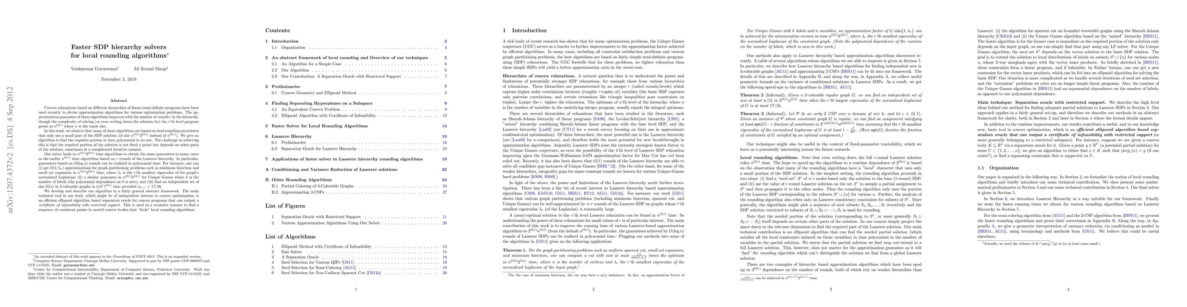 Convex relaxations based on different hierarchies of linear/semi-definite programs have been used recently to devise approximation algorithms for various optimization problems. The approximation guarantee of these algorithms improves with the number of {\em rounds} $r$ in the hierarchy, though the complexity of solving (or even writing down the solution for) the $r$'th level program grows as $n^{\Omega(r)}$ where $n$ is the input size. In this work, we observe that many of these algorithms are based on {\em local} rounding procedures that only use a small part of the SDP solution (of size $n^{O(1)} 2^{O(r)}$ instead of $n^{\Omega(r)}$). We give an algorithm to find the requisite portion in time polynomial in its size. The challenge in achieving this is that the required portion of the solution is not fixed a priori but depends on other parts of the solution, sometimes in a complicated iterative manner. Our solver leads to $n^{O(1)} 2^{O(r)}$ time algorithms to obtain the same guarantees in many cases as the earlier $n^{O(r)}$ time algorithms based on $r$ rounds of the Lasserre hierarchy. In particular, guarantees based on $O(\log n)$ rounds can be realized in polynomial time. We develop and describe our algorithm in a fairly general abstract framework. The main technical tool in our work, which might be of independent interest in convex optimization, is an efficient ellipsoid algorithm based separation oracle for convex programs that can output a {\em certificate of infeasibility with restricted support}. This is used in a recursive manner to find a sequence of consistent points in nested convex bodies that "fools" local rounding algorithms.