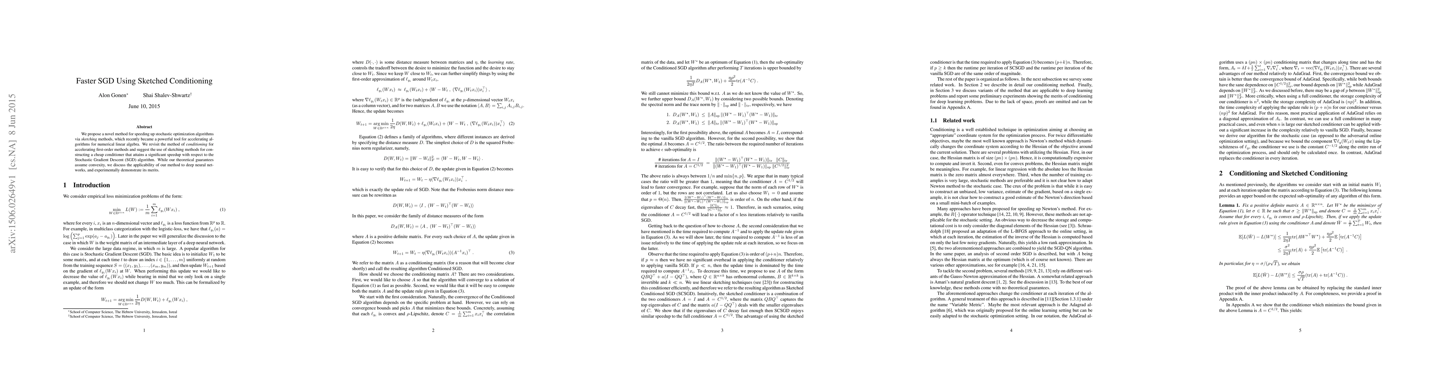 We propose a novel method for speeding up stochastic optimization algorithms via sketching methods, which recently became a powerful tool for accelerating algorithms for numerical linear algebra. We revisit the method of conditioning for accelerating first-order methods and suggest the use of sketching methods for constructing a cheap conditioner that attains a significant speedup with respect to the Stochastic Gradient Descent (SGD) algorithm. While our theoretical guarantees assume convexity, we discuss the applicability of our method to deep neural networks, and experimentally demonstrate its merits.