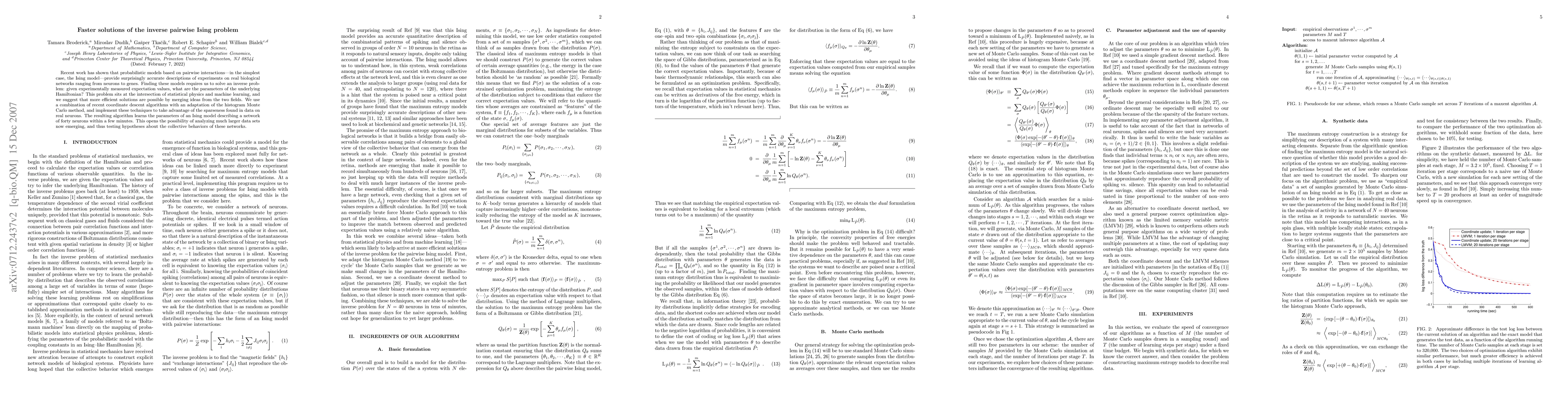 Recent work has shown that probabilistic models based on pairwise interactions-in the simplest case, the Ising model-provide surprisingly accurate descriptions of experiments on real biological networks ranging from neurons to genes. Finding these models requires us to solve an inverse problem: given experimentally measured expectation values, what are the parameters of the underlying Hamiltonian? This problem sits at the intersection of statistical physics and machine learning, and we suggest that more efficient solutions are possible by merging ideas from the two fields. We use a combination of recent coordinate descent algorithms with an adaptation of the histogram Monte Carlo method, and implement these techniques to take advantage of the sparseness found in data on real neurons. The resulting algorithm learns the parameters of an Ising model describing a network of forty neurons within a few minutes. This opens the possibility of analyzing much larger data sets now emerging, and thus testing hypotheses about the collective behaviors of these networks.