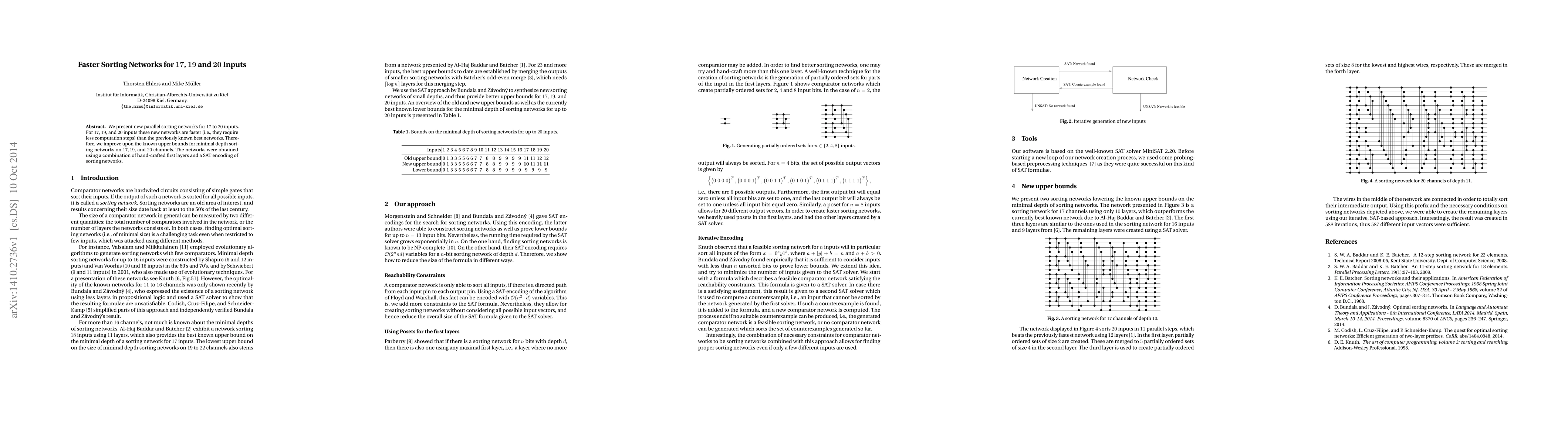 This paper introduces novel parallel sorting networks for 17, 19, and 20 inputs that outperform previous best networks by requiring fewer computation steps, thereby improving upper bounds for minimal depth sorting networks. The new networks combine hand-crafted first layers with a SAT encoding technique.