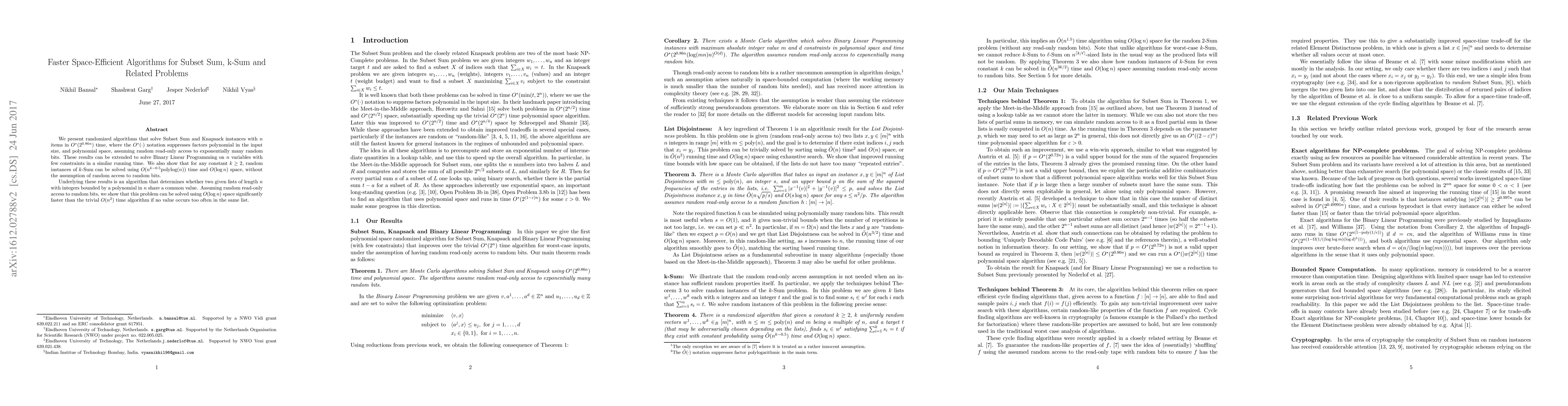 This paper presents space-efficient Monte Carlo algorithms for solving Subset Sum, Knapsack, and k-Sum problems, achieving $O^*(2^{0.86n})$ time and polynomial space. It also extends these results to Binary Linear Programming and solves random instances of k-Sum with $O(n^{k-0.5}polylog(n))$ time and $O(\log n)$ space.