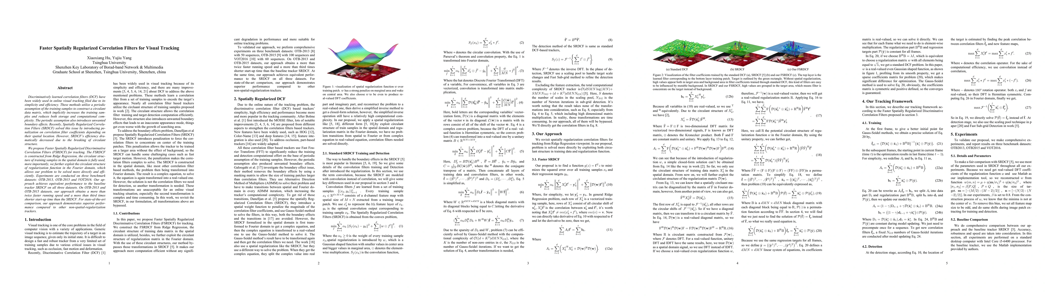 The paper proposes Faster Spatially Regularized Discriminative Correlation Filters (FSRDCF) to enhance visual tracking efficiency. It leverages Ridge Regression and exploits the circulant structure in both training and regularization functions, achieving faster speeds and shorter start-up times compared to Spatially Regularized Correlation Filters (SRDCF) while maintaining comparable performance.