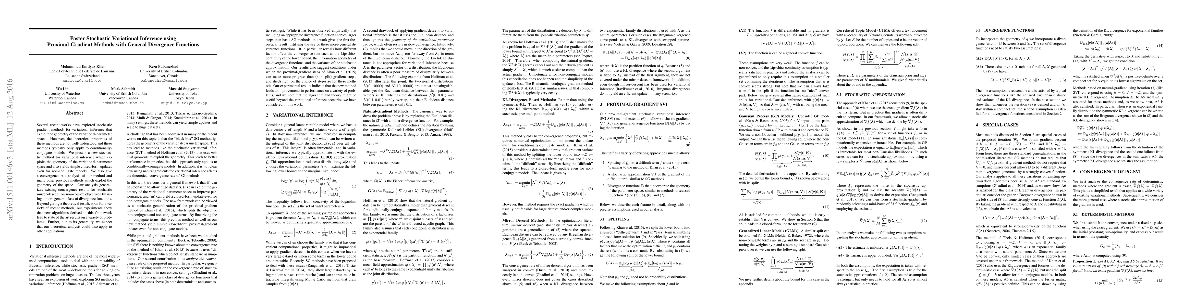 This paper introduces a novel stochastic variational inference method using proximal-gradient techniques that works for both conjugate and non-conjugate models, providing theoretical convergence rates and generalizing existing divergence function analyses. Experimental results demonstrate state-of-the-art performance across various problems.