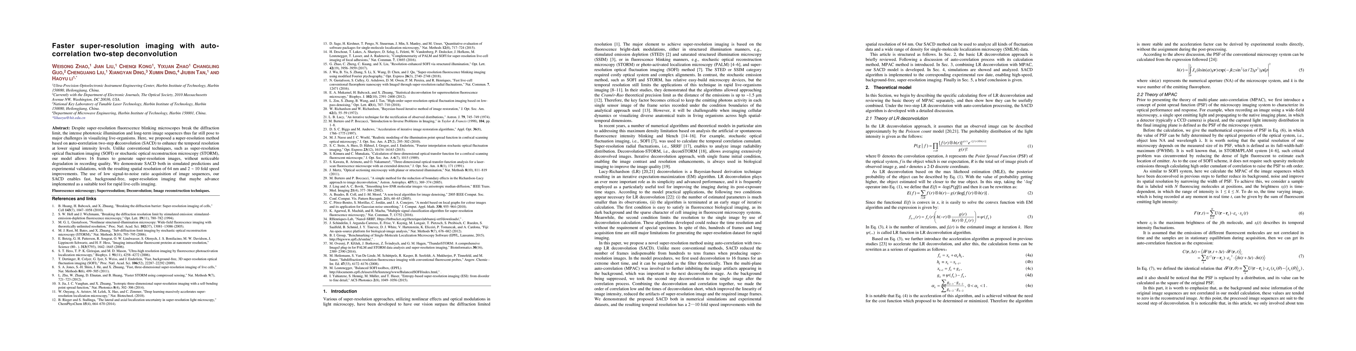This paper proposes a novel super-resolution imaging method called auto-correlation two-step deconvolution (SACD) to enhance temporal resolution at lower signal intensities. SACD achieves 2-10 fold speed improvements and maintains high recording quality, enabling rapid live-cell imaging without significant phototoxic effects.