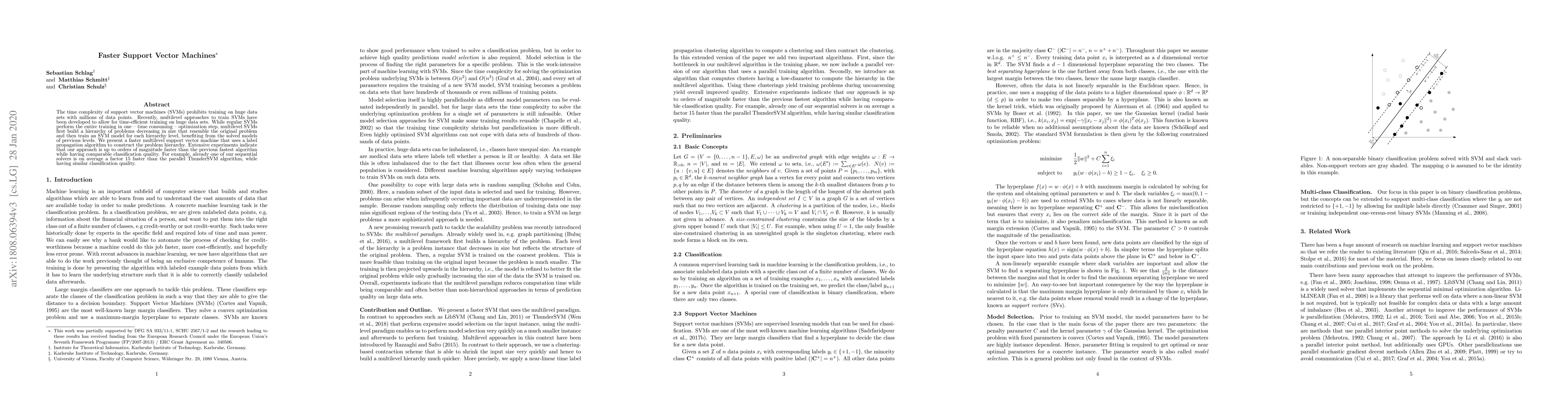 This paper introduces a faster multilevel support vector machine (SVM) that employs a label propagation algorithm to construct a hierarchy of smaller problems, significantly reducing training time compared to traditional SVMs. Experimental results show that the proposed method is up to orders of magnitude faster than existing algorithms, while maintaining comparable classification accuracy.