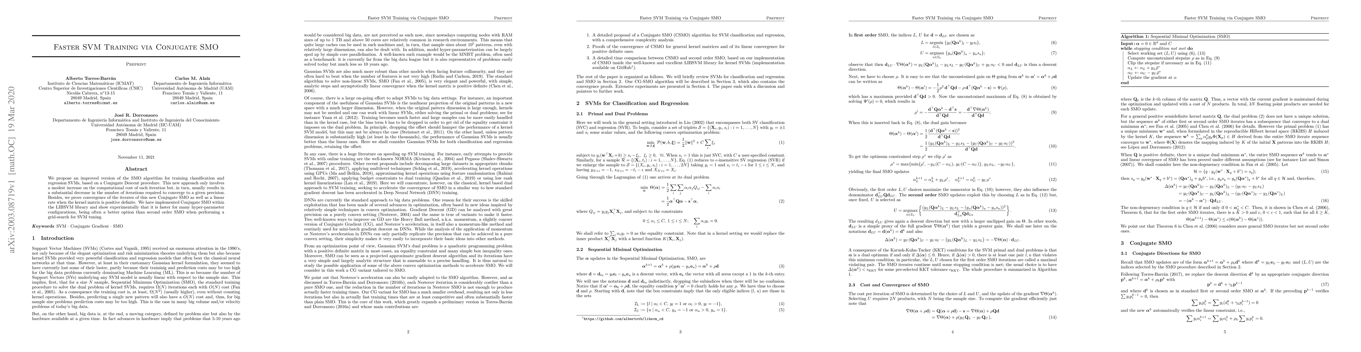 We propose an improved version of the SMO algorithm for training classification and regression SVMs, based on a Conjugate Descent procedure. This new approach only involves a modest increase on the computational cost of each iteration but, in turn, usually results in a substantial decrease in the number of iterations required to converge to a given precision. Besides, we prove convergence of the iterates of this new Conjugate SMO as well as a linear rate when the kernel matrix is positive definite. We have implemented Conjugate SMO within the LIBSVM library and show experimentally that it is faster for many hyper-parameter configurations, being often a better option than second order SMO when performing a grid-search for SVM tuning.