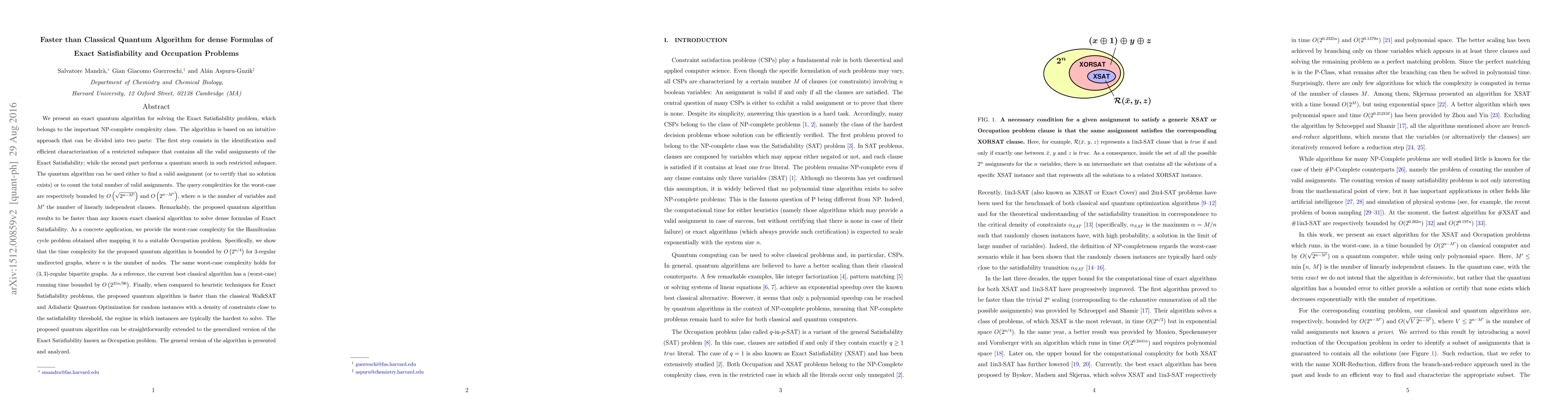 This paper introduces an exact quantum algorithm for solving the Exact Satisfiability (XSAT) problem, outperforming classical algorithms by query complexities of $O(\sqrt{2^{n-M^{\prime}}})$ and $O(2^{n-M^{\prime}})$. It also applies to the Hamiltonian cycle problem, achieving a worst-case complexity of $O(2^{n/4})$ for 3-regular graphs.