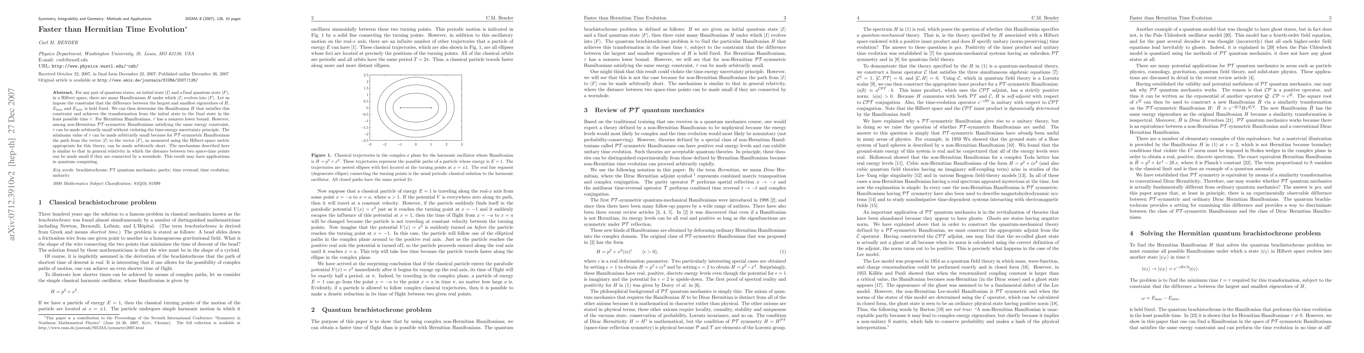 For any pair of quantum states, an initial state |I> and a final quantum state |F>, in a Hilbert space, there are many Hamiltonians H under which |I> evolves into |F>. Let us impose the constraint that the difference between the largest and smallest eigenvalues of H, E_max and E_min, is held fixed. We can then determine the Hamiltonian H that satisfies this constraint and achieves the transformation from the initial state to the final state in the least possible time \tau. For Hermitian Hamiltonians, \tau has a nonzero lower bound. However, among non-Hermitian PT-symmetric Hamiltonians satisfying the same energy constraint, \tau can be made arbitrarily small without violating the time-energy uncertainty principle. The minimum value of \tau can be made arbitrarily small because for PT-symmetric Hamiltonians the path from the vector |I> to the vector |F>, as measured using the Hilbert-space metric appropriate for this theory, can be made arbitrarily short. The mechanism described here is similar to that in general relativity in which the distance between two space-time points can be made small if they are connected by a wormhole. This result may have applications in quantum computing.