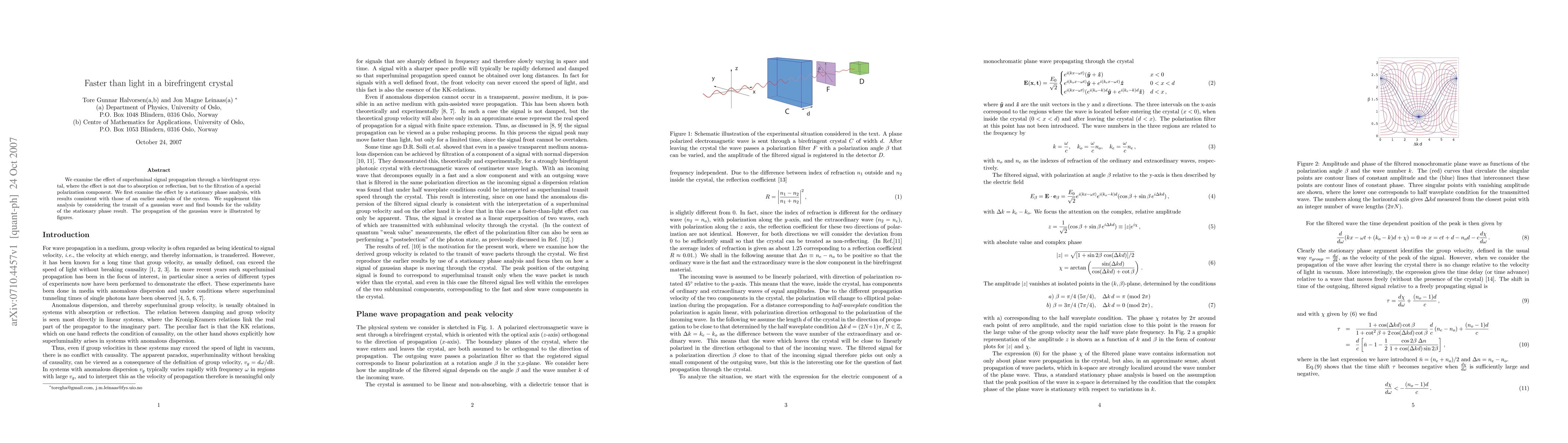 We examine the effect of superluminal signal propagation through a birefringent crystal, where the effect is not due to absorption or reflection, but to the filtration of a special polarization component. We first examine the effect by a stationary phase analysis, with results consistent with those of an earlier analysis of the system. We supplement this analysis by considering the transit of a gaussian wave and find bounds for the validity of the stationary phase result. The propagation of the gaussian wave is illustrated by figures.
