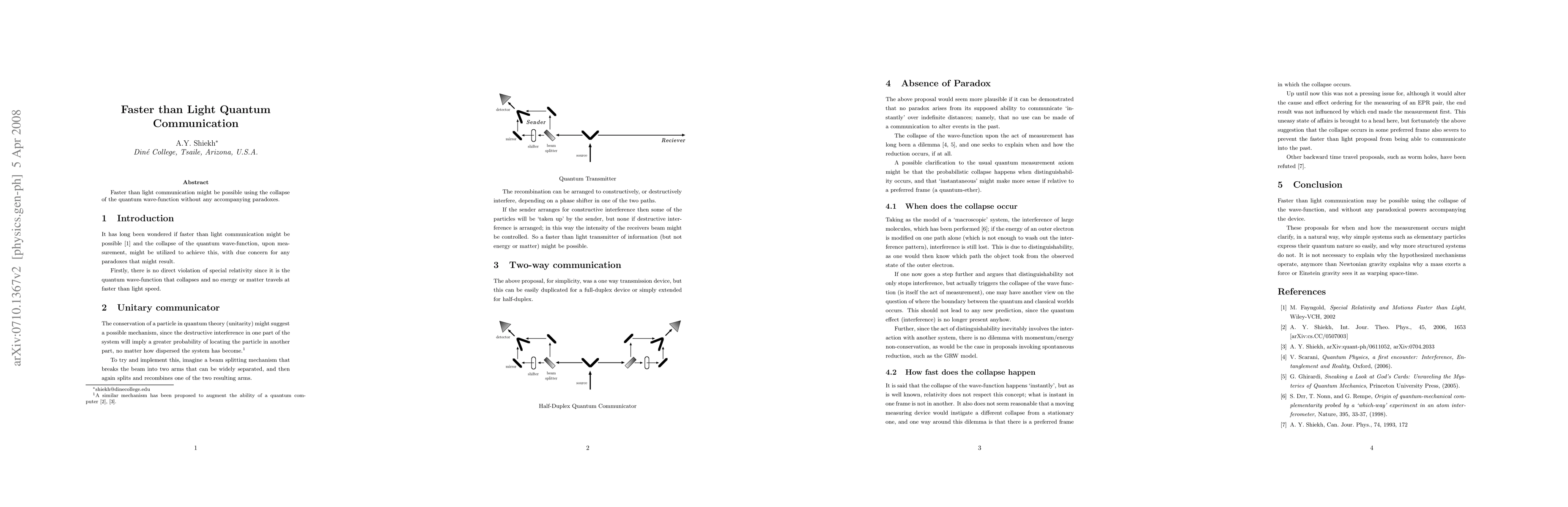 The paper introduces a novel approach to faster-than-light communication based on wave-function collapse and quantum interference, claiming no paradoxes arise.