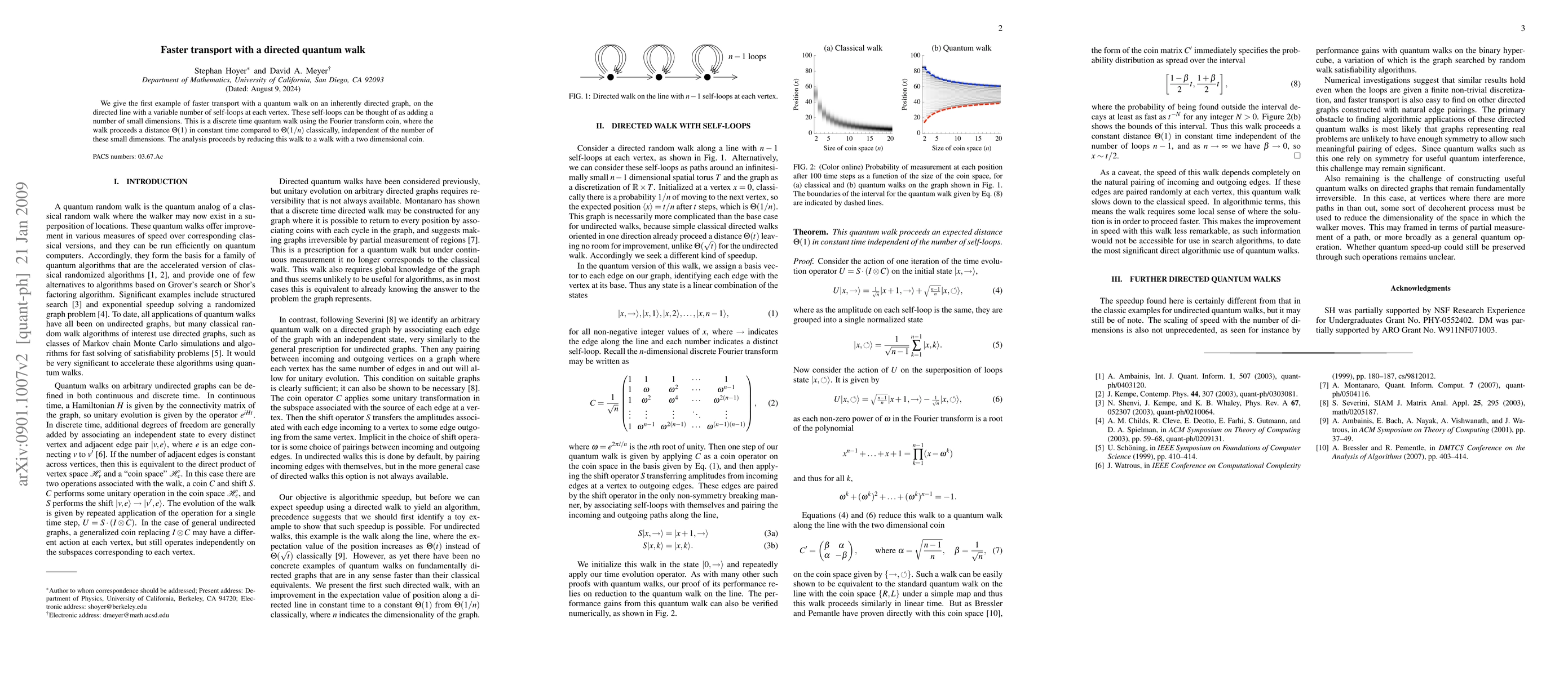This research demonstrates a quantum walk that can transport particles faster than classical methods on a directed graph with variable self-loops, improving performance to O(1) time complexity.