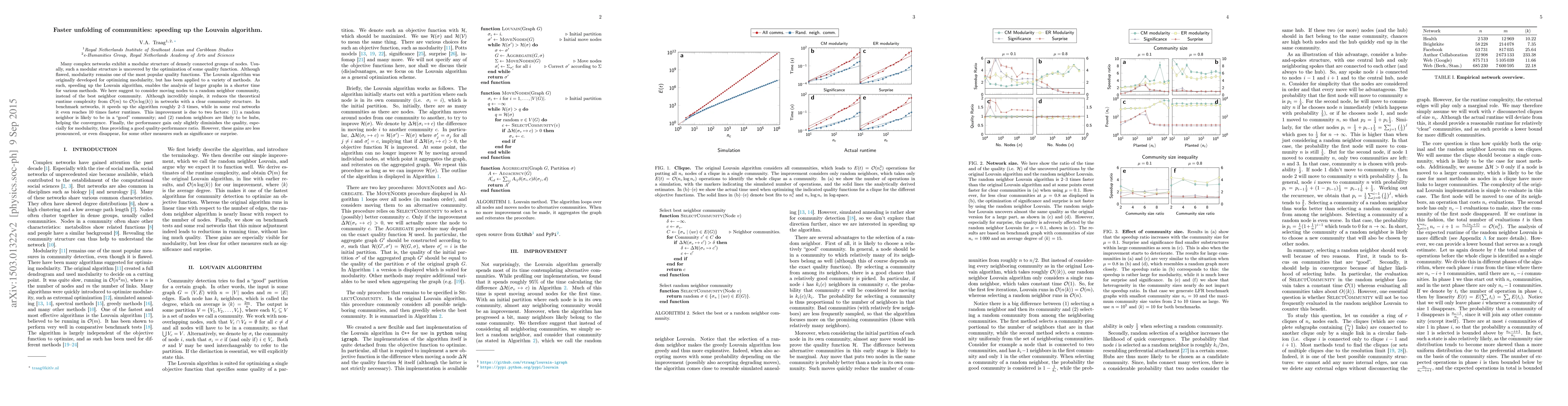 This paper proposes a modification to the Louvain algorithm to speed up community detection in complex networks by moving nodes to random neighbor communities instead of the best neighbor community, reducing runtime complexity and achieving up to 10 times faster processing times in some cases, while maintaining high modularity quality.