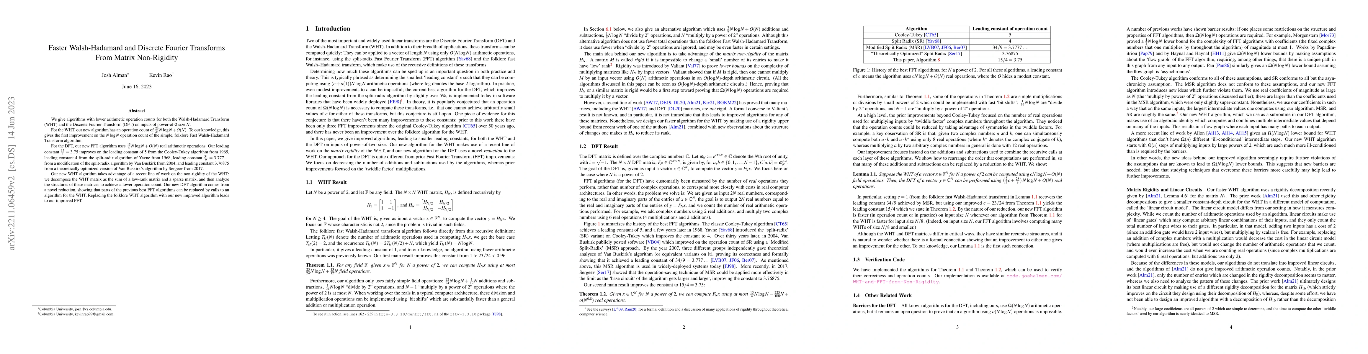 We give algorithms with lower arithmetic operation counts for both the Walsh-Hadamard Transform (WHT) and the Discrete Fourier Transform (DFT) on inputs of power-of-2 size $N$. For the WHT, our new algorithm has an operation count of $\frac{23}{24}N \log N + O(N)$. To our knowledge, this gives the first improvement on the $N \log N$ operation count of the simple, folklore Fast Walsh-Hadamard Transform algorithm. For the DFT, our new FFT algorithm uses $\frac{15}{4}N \log N + O(N)$ real arithmetic operations. Our leading constant $\frac{15}{4} = 3.75$ improves on the leading constant of $5$ from the Cooley-Tukey algorithm from 1965, leading constant $4$ from the split-radix algorithm of Yavne from 1968, leading constant $\frac{34}{9}=3.777\ldots$ from a modification of the split-radix algorithm by Van Buskirk from 2004, and leading constant $3.76875$ from a theoretically optimized version of Van Buskirk's algorithm by Sergeev from 2017. Our new WHT algorithm takes advantage of a recent line of work on the non-rigidity of the WHT: we decompose the WHT matrix as the sum of a low-rank matrix and a sparse matrix, and then analyze the structures of these matrices to achieve a lower operation count. Our new DFT algorithm comes from a novel reduction, showing that parts of the previous best FFT algorithms can be replaced by calls to an algorithm for the WHT. Replacing the folklore WHT algorithm with our new improved algorithm leads to our improved FFT.