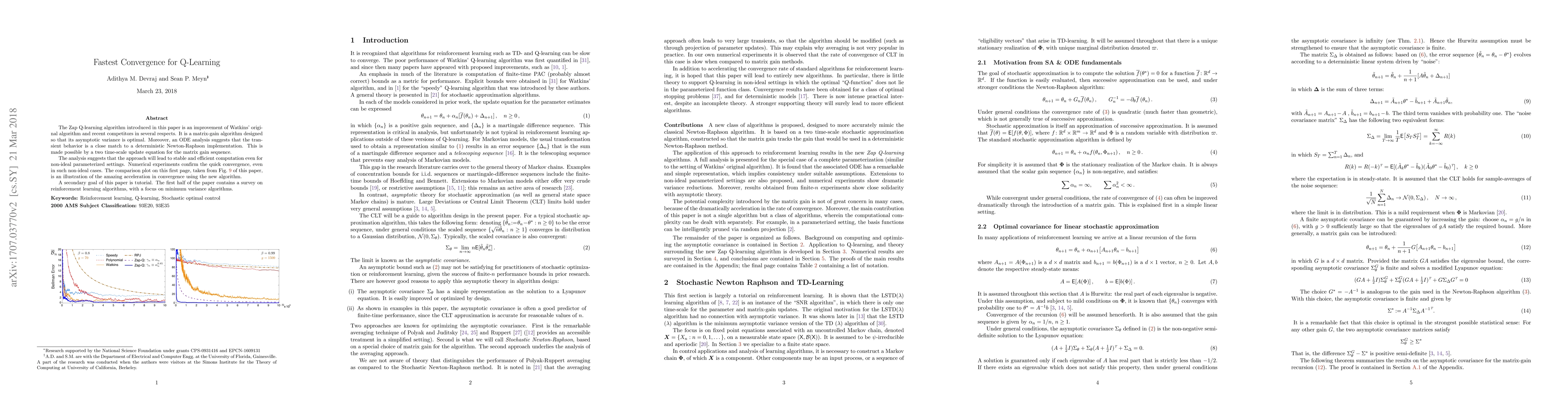 The Zap Q-learning algorithm introduced in this paper is an improvement of Watkins' original algorithm and recent competitors in several respects. It is a matrix-gain algorithm designed so that its asymptotic variance is optimal. Moreover, an ODE analysis suggests that the transient behavior is a close match to a deterministic Newton-Raphson implementation. This is made possible by a two time-scale update equation for the matrix gain sequence. The analysis suggests that the approach will lead to stable and efficient computation even for non-ideal parameterized settings. Numerical experiments confirm the quick convergence, even in such non-ideal cases. A secondary goal of this paper is tutorial. The first half of the paper contains a survey on reinforcement learning algorithms, with a focus on minimum variance algorithms.