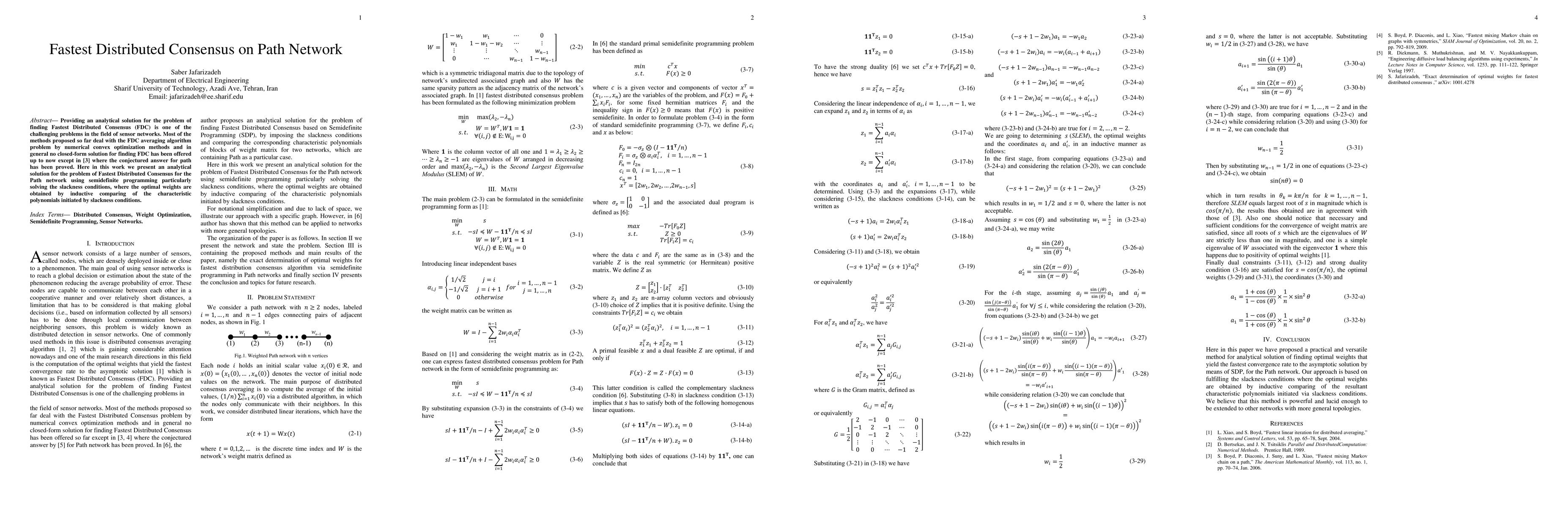 This paper presents an analytical solution for achieving Fastest Distributed Consensus (FDC) in path networks using semidefinite programming. It resolves the FDC averaging problem by solving slackness conditions and obtaining optimal weights through inductive comparison of characteristic polynomials.