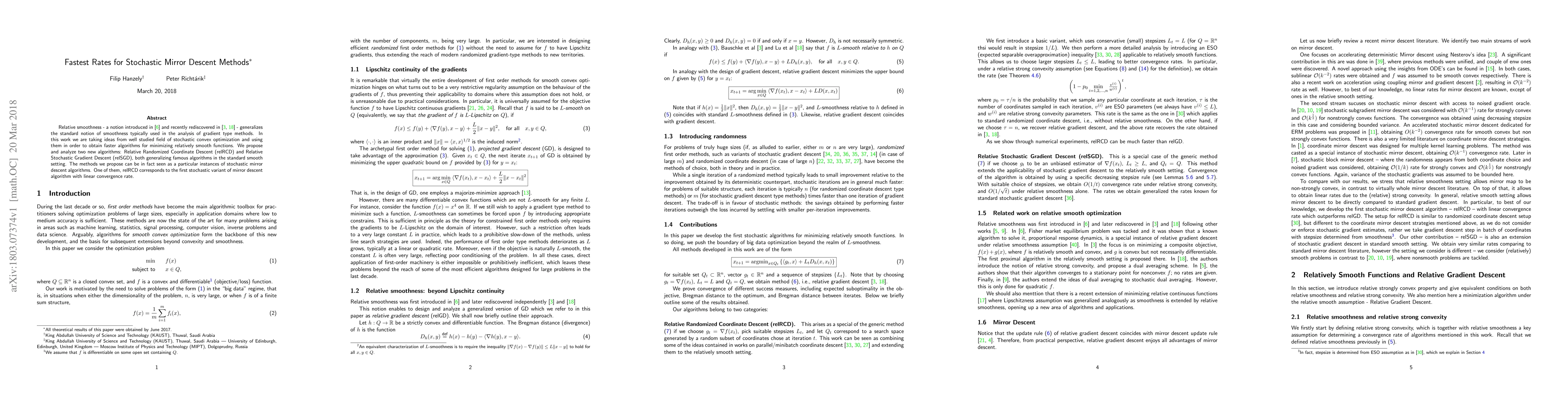 This paper proposes two new stochastic mirror descent algorithms, Relative Randomized Coordinate Descent (relRCD) and Relative Stochastic Gradient Descent (relSGD), for minimizing relatively smooth functions, achieving faster convergence rates compared to traditional methods. relRCD is the first stochastic variant of mirror descent with a linear convergence rate.