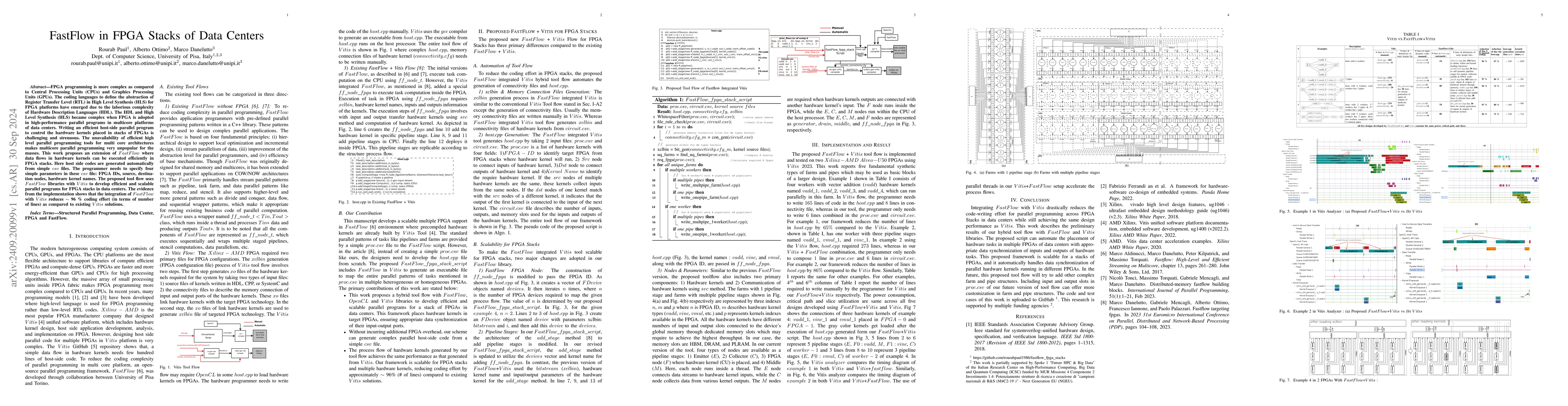 This paper proposes an extension of FastFlow to simplify FPGA programming in data center stacks, generating host-side parallel programs automatically from CSV files that specify FPGA IDs, source/destination nodes, and hardware kernel names. Integration with Vitis tools reduces coding effort by 96% compared to existing methods.