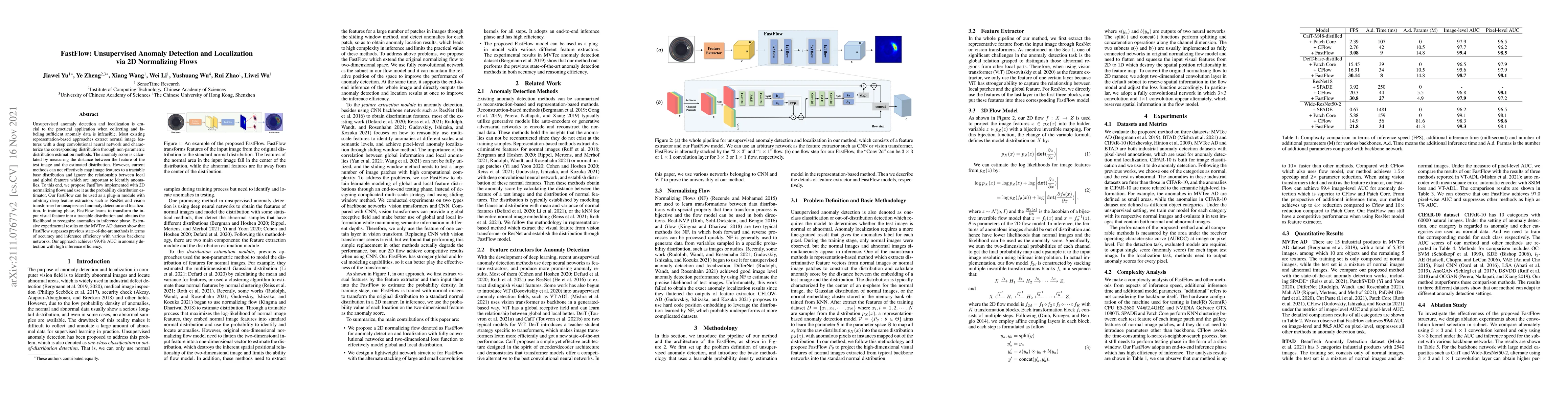 FastFlow employs 2D normalizing flows for unsupervised anomaly detection and localization, effectively mapping image features to a tractable distribution and capturing local-global feature relationships. It outperforms previous methods on the MVTec AD dataset, achieving 99.4% AUC with high inference efficiency.