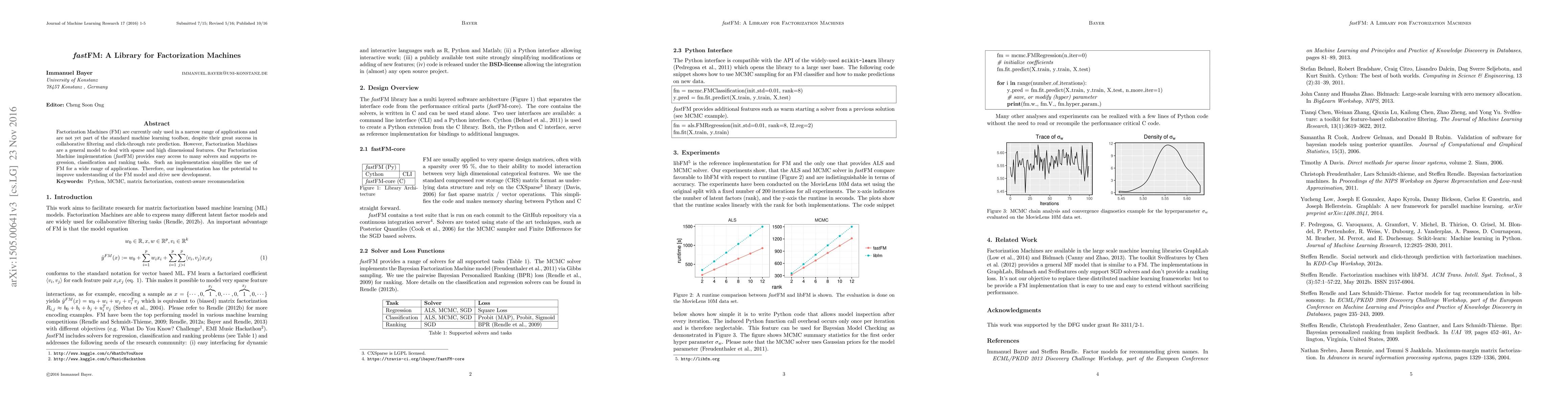 Factorization Machines (FM) are only used in a narrow range of applications and are not part of the standard toolbox of machine learning models. This is a pity, because even though FMs are recognized as being very successful for recommender system type applications they are a general model to deal with sparse and high dimensional features. Our Factorization Machine implementation provides easy access to many solvers and supports regression, classification and ranking tasks. Such an implementation simplifies the use of FM's for a wide field of applications. This implementation has the potential to improve our understanding of the FM model and drive new development.
