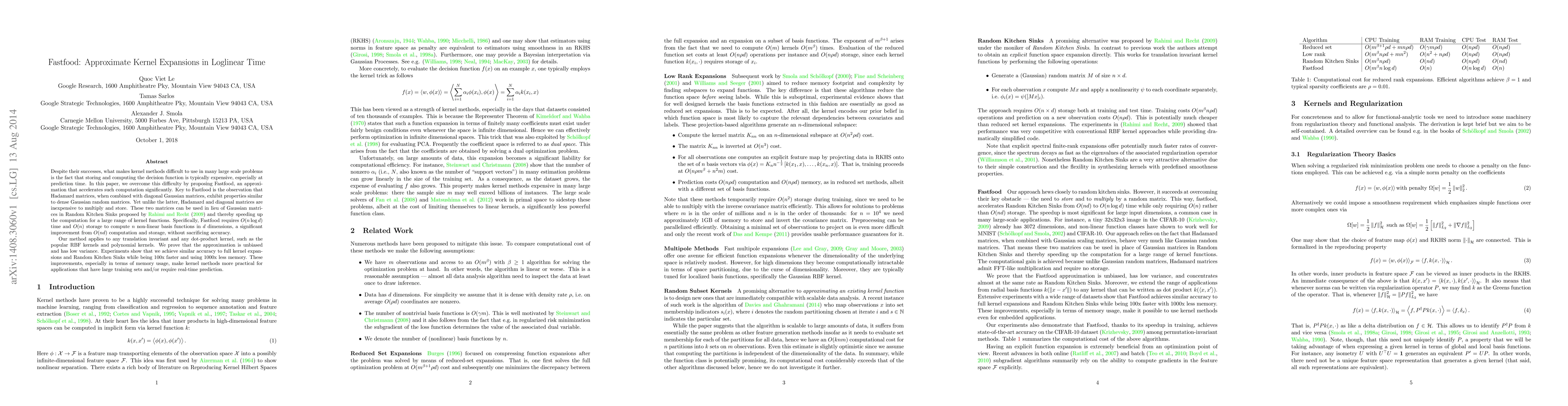 Despite their successes, what makes kernel methods difficult to use in many large scale problems is the fact that storing and computing the decision function is typically expensive, especially at prediction time. In this paper, we overcome this difficulty by proposing Fastfood, an approximation that accelerates such computation significantly. Key to Fastfood is the observation that Hadamard matrices, when combined with diagonal Gaussian matrices, exhibit properties similar to dense Gaussian random matrices. Yet unlike the latter, Hadamard and diagonal matrices are inexpensive to multiply and store. These two matrices can be used in lieu of Gaussian matrices in Random Kitchen Sinks proposed by Rahimi and Recht (2009) and thereby speeding up the computation for a large range of kernel functions. Specifically, Fastfood requires O(n log d) time and O(n) storage to compute n non-linear basis functions in d dimensions, a significant improvement from O(nd) computation and storage, without sacrificing accuracy. Our method applies to any translation invariant and any dot-product kernel, such as the popular RBF kernels and polynomial kernels. We prove that the approximation is unbiased and has low variance. Experiments show that we achieve similar accuracy to full kernel expansions and Random Kitchen Sinks while being 100x faster and using 1000x less memory. These improvements, especially in terms of memory usage, make kernel methods more practical for applications that have large training sets and/or require real-time prediction.