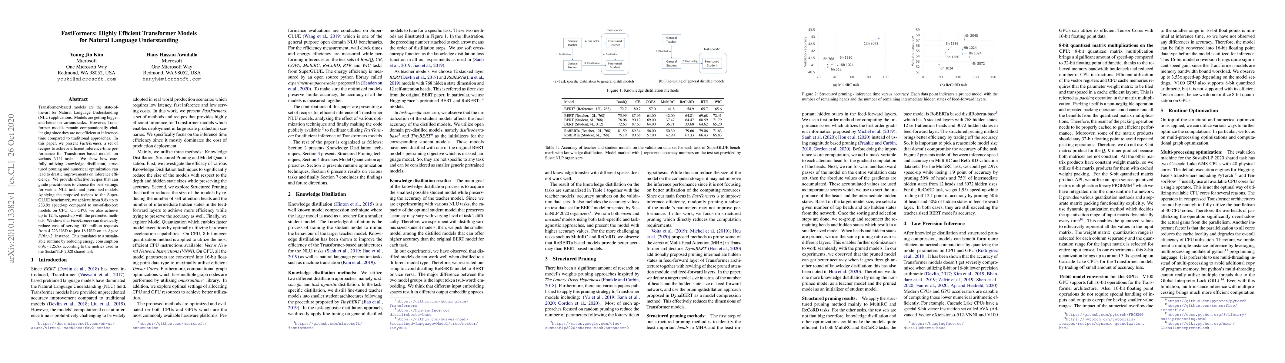 FastFormers presents techniques to enhance the efficiency of Transformer models for Natural Language Understanding, achieving significant speed-ups and cost reductions through knowledge distillation, structured pruning, and numerical optimization. The proposed methods deliver up to 233.9x speed-up on CPU and 12.4x on GPU, substantially lowering the operational costs and energy consumption.