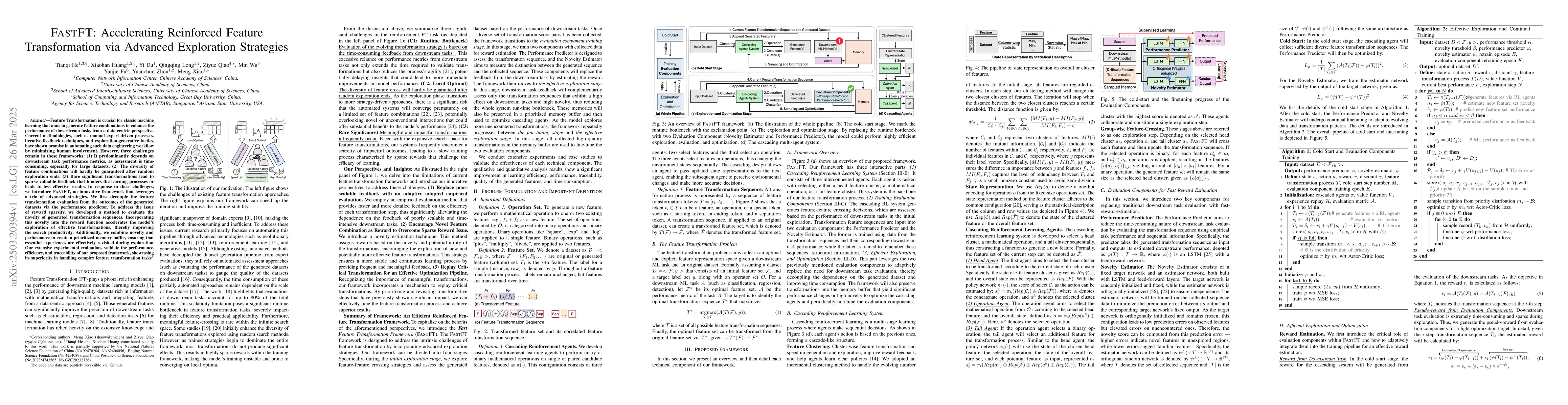 FastFT introduces advanced exploration strategies to accelerate reinforced feature transformation, decoupling evaluation from downstream task metrics and addressing reward sparsity through novelty-based evaluation and a prioritized memory buffer. Experimental results demonstrate its efficiency and effectiveness in complex feature transformation tasks.
