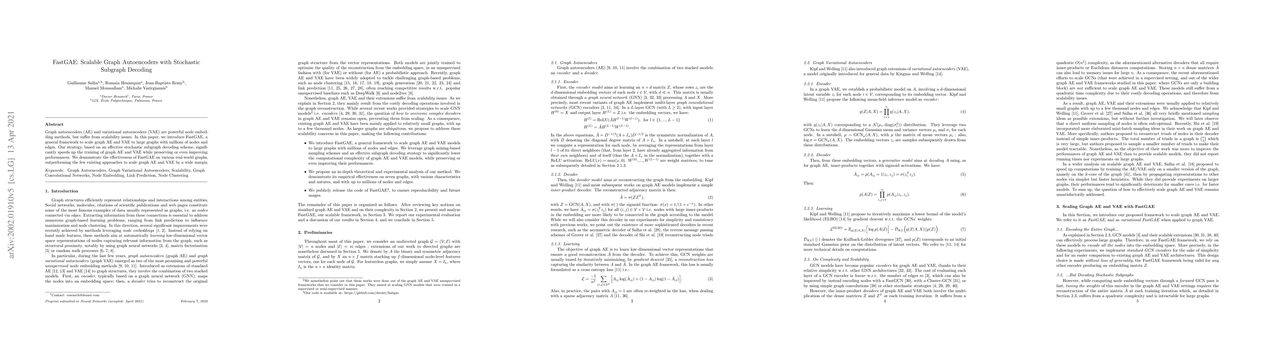 FastGAE introduces a scalable framework for graph autoencoders and variational autoencoders, employing a stochastic subgraph decoding scheme to enhance training speed and performance on large graphs. The method outperforms existing scaling approaches for graph AE and VAE on real-world datasets.