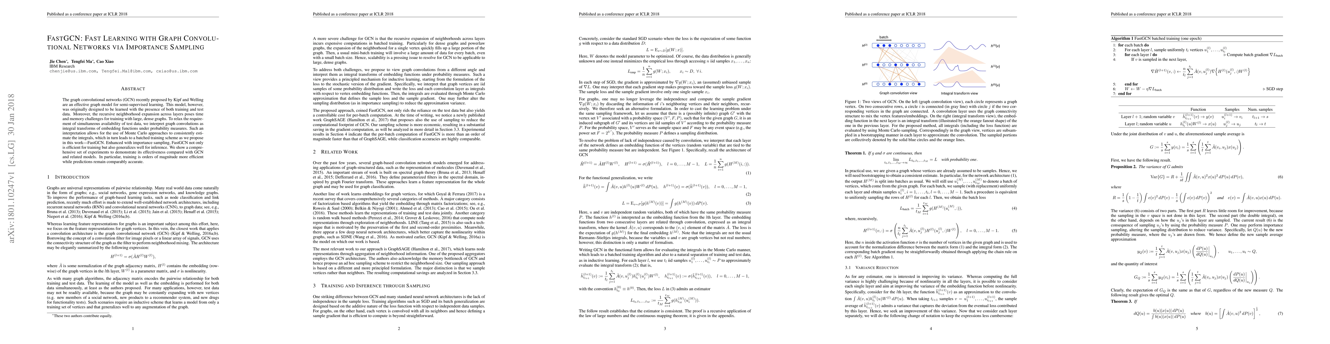The graph convolutional networks (GCN) recently proposed by Kipf and Welling are an effective graph model for semi-supervised learning. This model, however, was originally designed to be learned with the presence of both training and test data. Moreover, the recursive neighborhood expansion across layers poses time and memory challenges for training with large, dense graphs. To relax the requirement of simultaneous availability of test data, we interpret graph convolutions as integral transforms of embedding functions under probability measures. Such an interpretation allows for the use of Monte Carlo approaches to consistently estimate the integrals, which in turn leads to a batched training scheme as we propose in this work---FastGCN. Enhanced with importance sampling, FastGCN not only is efficient for training but also generalizes well for inference. We show a comprehensive set of experiments to demonstrate its effectiveness compared with GCN and related models. In particular, training is orders of magnitude more efficient while predictions remain comparably accurate.