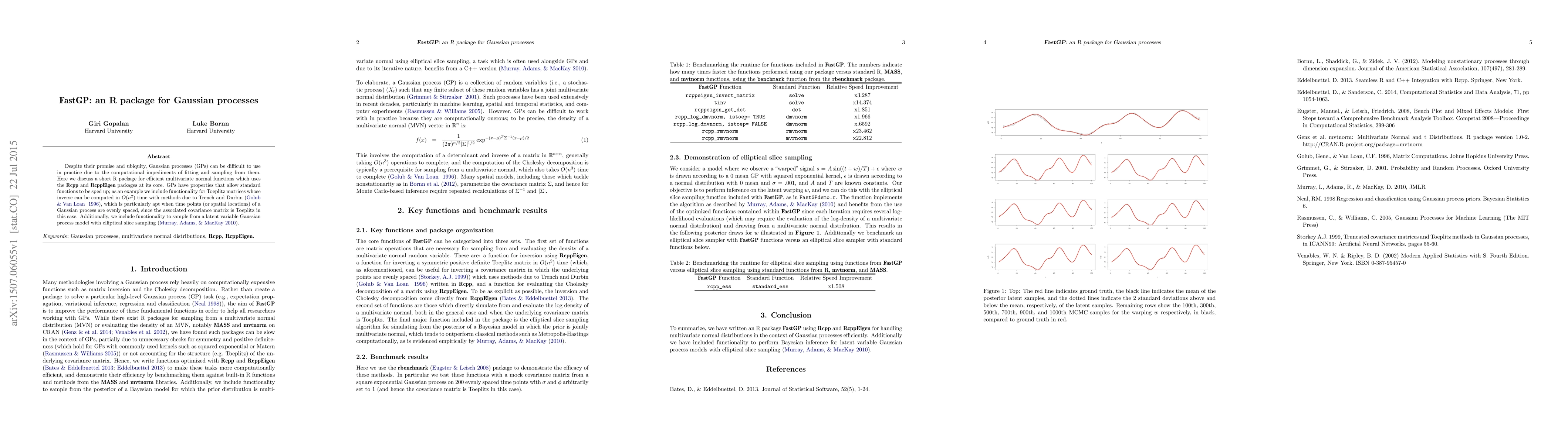 FastGP is an R package designed to efficiently handle Gaussian processes using Rcpp and RcppEigen. It leverages fast computation methods for Toeplitz matrices and elliptical slice sampling for latent variable models, significantly speeding up the fitting and sampling processes.