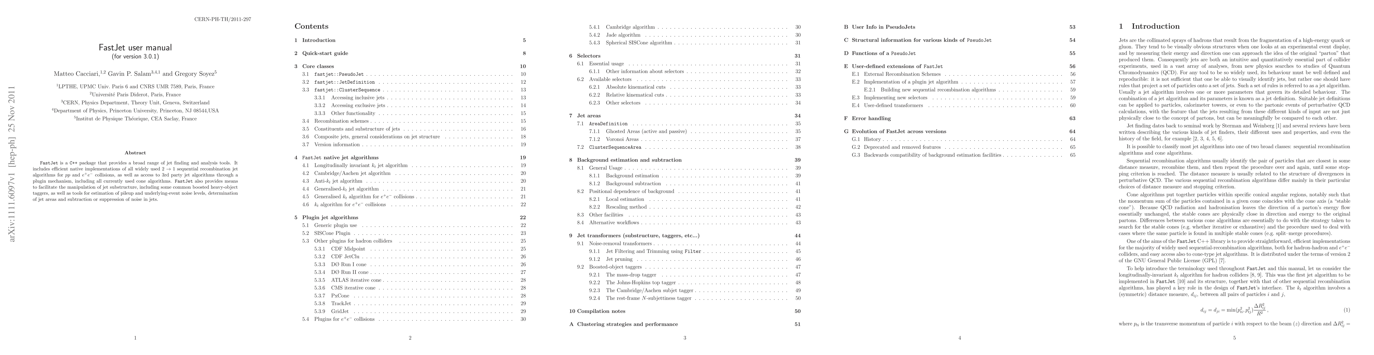 FastJet is a C++ package that provides a broad range of jet finding and analysis tools. It includes efficient native implementations of all widely used 2-to-1 sequential recombination jet algorithms for pp and e+e- collisions, as well as access to 3rd party jet algorithms through a plugin mechanism, including all currently used cone algorithms. FastJet also provides means to facilitate the manipulation of jet substructure, including some common boosted heavy-object taggers, as well as tools for estimation of pileup and underlying-event noise levels, determination of jet areas and subtraction or suppression of noise in jets.