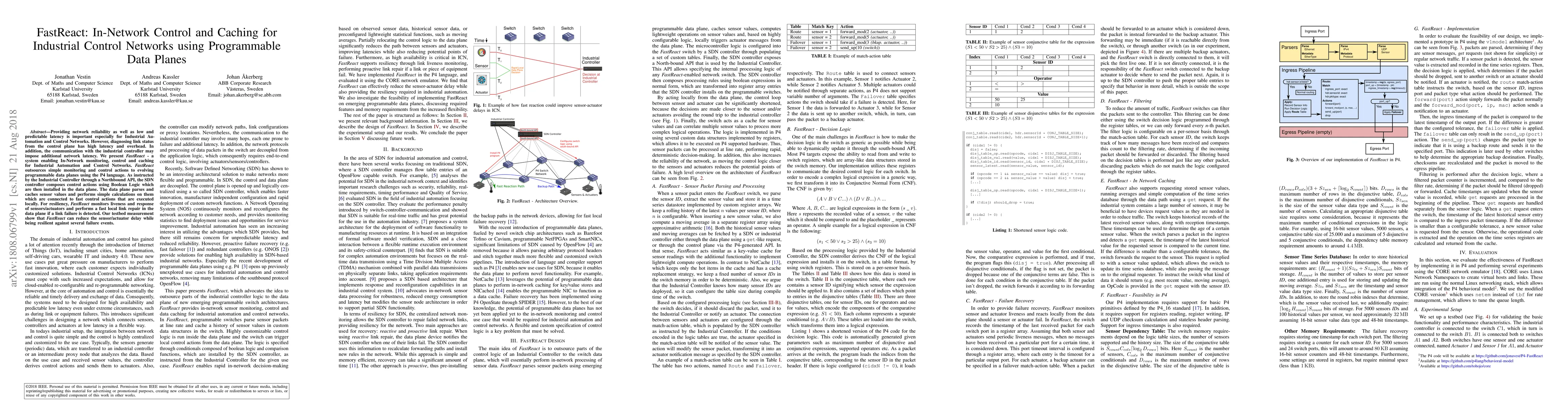 FastReact enables in-network control and caching for industrial control networks using programmable data planes, outsourcing simple monitoring and control actions to evolving programmable data planes using the P4 language.