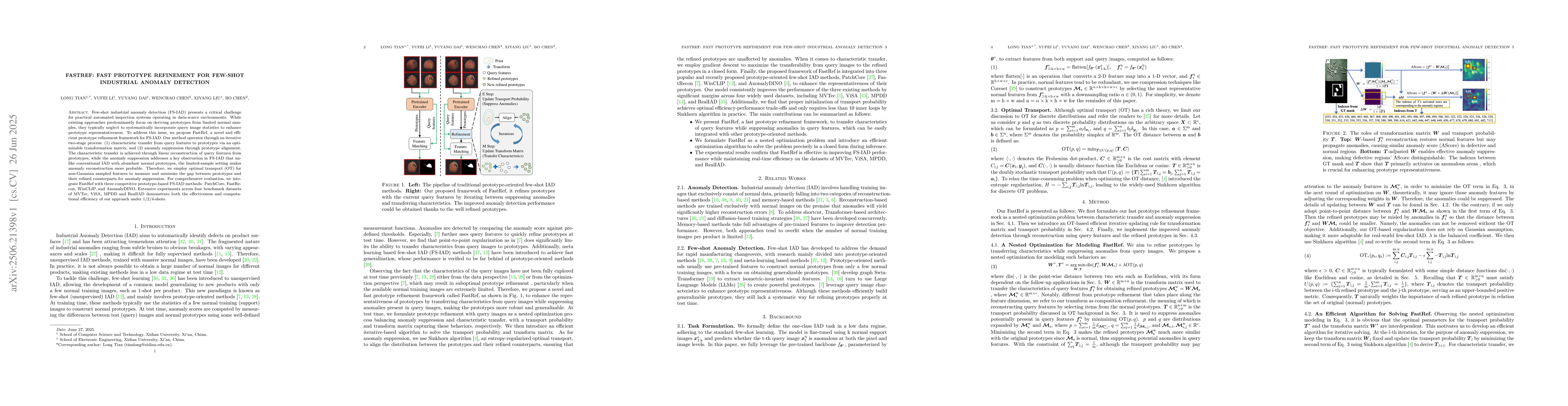 Few-shot industrial anomaly detection (FS-IAD) presents a critical challenge for practical automated inspection systems operating in data-scarce environments. While existing approaches predominantly focus on deriving prototypes from limited normal samples, they typically neglect to systematically incorporate query image statistics to enhance prototype representativeness. To address this issue, we propose FastRef, a novel and efficient prototype refinement framework for FS-IAD. Our method operates through an iterative two-stage process: (1) characteristic transfer from query features to prototypes via an optimizable transformation matrix, and (2) anomaly suppression through prototype alignment. The characteristic transfer is achieved through linear reconstruction of query features from prototypes, while the anomaly suppression addresses a key observation in FS-IAD that unlike conventional IAD with abundant normal prototypes, the limited-sample setting makes anomaly reconstruction more probable. Therefore, we employ optimal transport (OT) for non-Gaussian sampled features to measure and minimize the gap between prototypes and their refined counterparts for anomaly suppression. For comprehensive evaluation, we integrate FastRef with three competitive prototype-based FS-IAD methods: PatchCore, FastRecon, WinCLIP, and AnomalyDINO. Extensive experiments across four benchmark datasets of MVTec, ViSA, MPDD and RealIAD demonstrate both the effectiveness and computational efficiency of our approach under 1/2/4-shots.