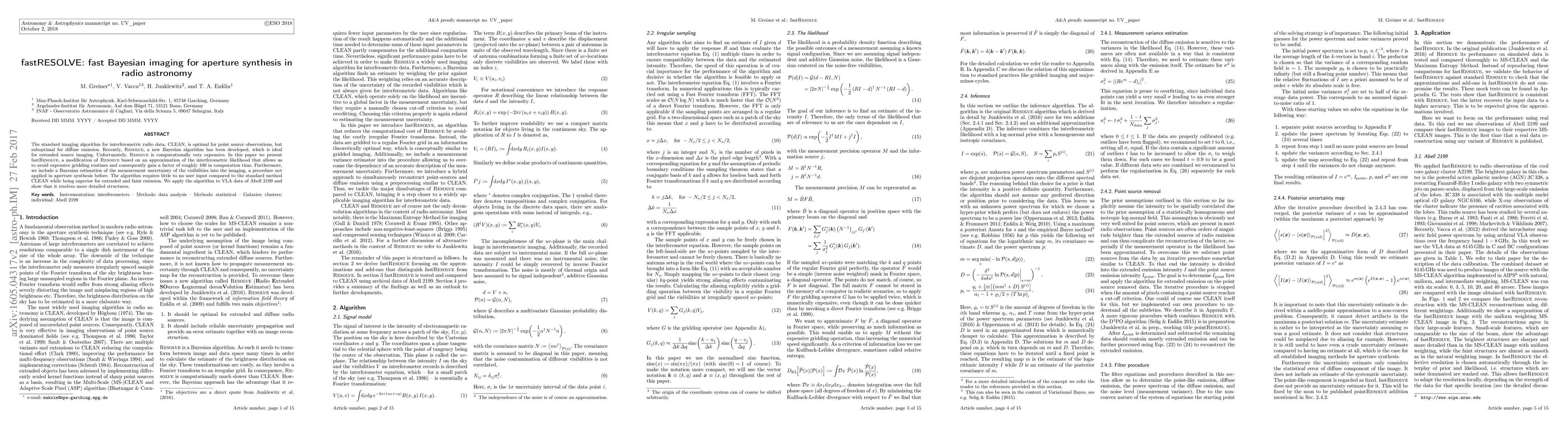 fastRESOLVE is a computationally efficient modification of the RESOLVE Bayesian imaging algorithm, designed to significantly reduce computation time by a factor of 100 while maintaining superior imaging for extended and faint radio sources compared to the traditional CLEAN method. It also incorporates Bayesian estimation of measurement uncertainty in visibilities.