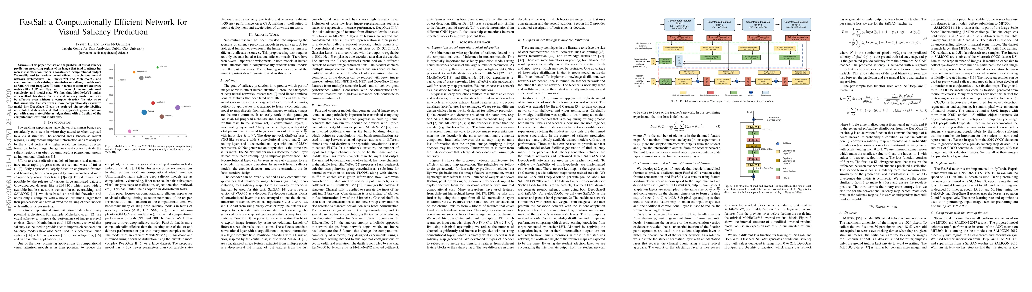 This paper focuses on the problem of visual saliency prediction, predicting regions of an image that tend to attract human visual attention, under a constrained computational budget. We modify and test various recent efficient convolutional neural network architectures like EfficientNet and MobileNetV2 and compare them with existing state-of-the-art saliency models such as SalGAN and DeepGaze II both in terms of standard accuracy metrics like AUC and NSS, and in terms of the computational complexity and model size. We find that MobileNetV2 makes an excellent backbone for a visual saliency model and can be effective even without a complex decoder. We also show that knowledge transfer from a more computationally expensive model like DeepGaze II can be achieved via pseudo-labelling an unlabelled dataset, and that this approach gives result on-par with many state-of-the-art algorithms with a fraction of the computational cost and model size. Source code is available at https://github.com/feiyanhu/FastSal.