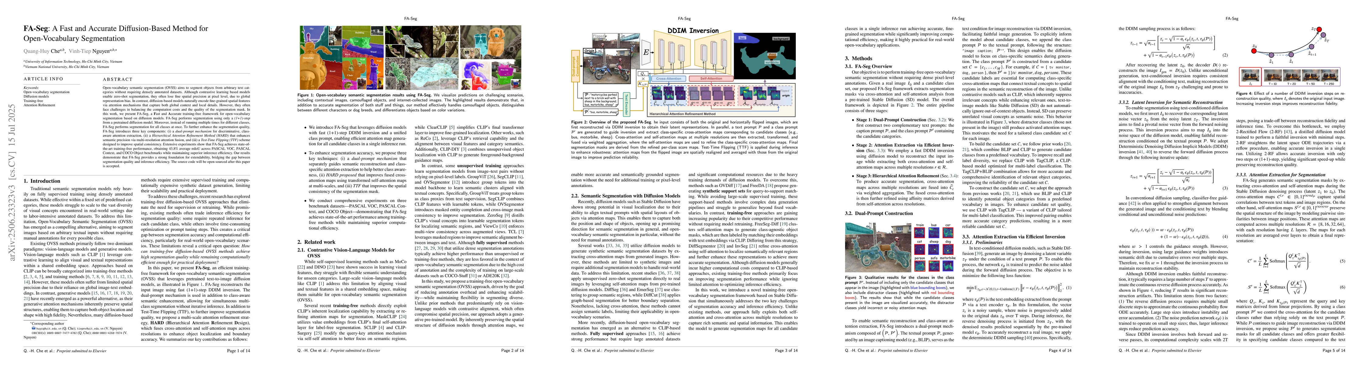 Open-vocabulary semantic segmentation (OVSS) aims to segment objects from arbitrary text categories without requiring densely annotated datasets. Although contrastive learning based models enable zero-shot segmentation, they often lose fine spatial precision at pixel level, due to global representation bias. In contrast, diffusion-based models naturally encode fine-grained spatial features via attention mechanisms that capture both global context and local details. However, they often face challenges in balancing the number of iterations with the quality of the segmentation. In this work, we propose FastSeg, a novel and efficient training-free framework with only (1+1)-step of reverse process of a pretrained diffusion model (e.g., Stable Diffusion). Moreover, instead of running multiple times for different classes, FastSeg performs segmentation for all classes at once. To further enhance the segmentation quality, FastSeg introduces three key components: (i) a dual-prompt mechanism for discriminative, class-aware attention extraction, (ii) a Hierarchical Attention Refinement Method (HARD) that enhances fused cross-attention using scale-aligned selfattention maps, and (iii) a Test-Time Flipping (TTF) scheme designed to improve spatial consistency. Extensive experiments show that FastSeg achieves state-of-the-art training-free performance, obtaining 43.8% average mIoU across PASCAL VOC, PASCAL Context, and COCO Object benchmarks while maintaining superior inference efficiency. Our results demonstrate that FastSeg provides a strong foundation for extendability, bridging the gap between segmentation quality and inference efficiency.