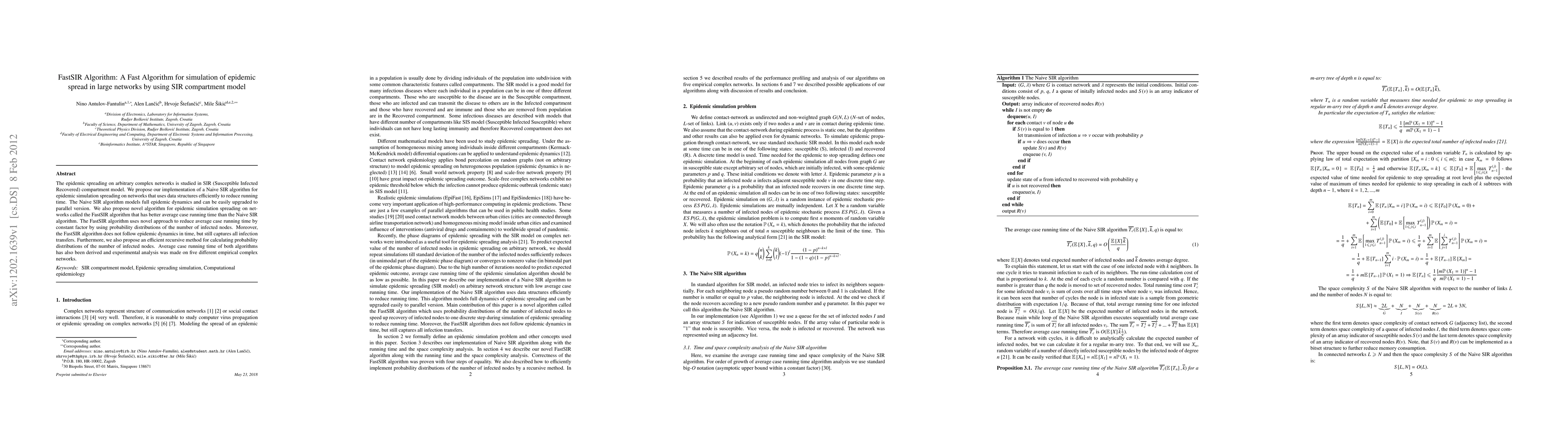 The FastSIR algorithm efficiently simulates epidemic spread in large networks using the SIR model, achieving better average case running time compared to the Naive SIR algorithm by leveraging probability distributions of infected nodes, while also providing an efficient recursive method for calculating these distributions. Experimental analysis on five empirical networks confirms its effectiveness.