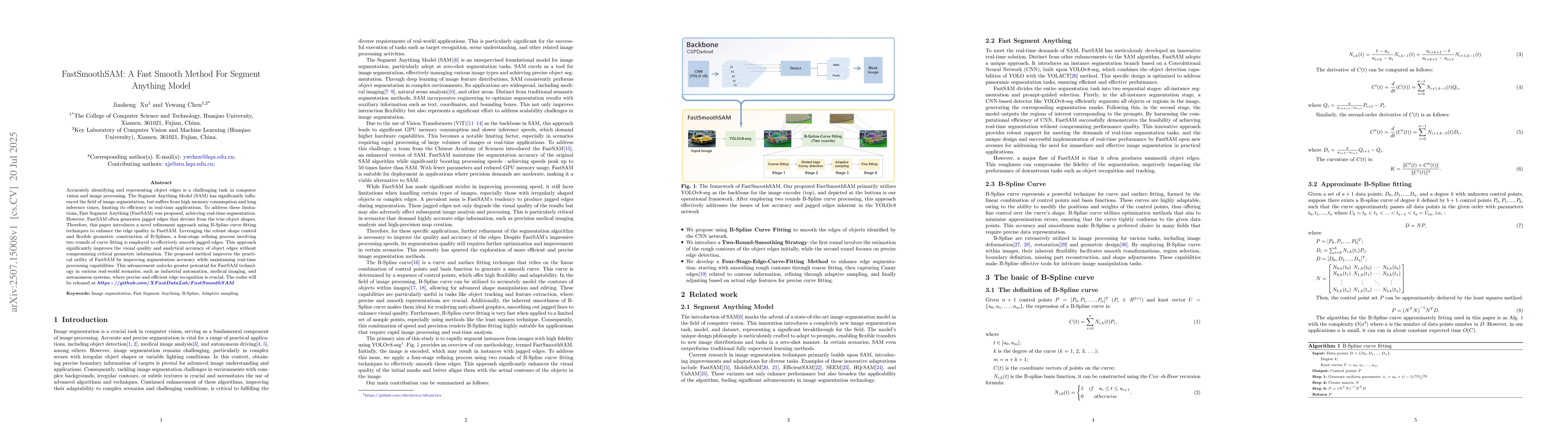 Accurately identifying and representing object edges is a challenging task in computer vision and image processing. The Segment Anything Model (SAM) has significantly influenced the field of image segmentation, but suffers from high memory consumption and long inference times, limiting its efficiency in real-time applications. To address these limitations, Fast Segment Anything (FastSAM) was proposed, achieving real-time segmentation. However, FastSAM often generates jagged edges that deviate from the true object shapes. Therefore, this paper introduces a novel refinement approach using B-Spline curve fitting techniques to enhance the edge quality in FastSAM. Leveraging the robust shape control and flexible geometric construction of B-Splines, a four-stage refining process involving two rounds of curve fitting is employed to effectively smooth jagged edges. This approach significantly improves the visual quality and analytical accuracy of object edges without compromising critical geometric information. The proposed method improves the practical utility of FastSAM by improving segmentation accuracy while maintaining real-time processing capabilities. This advancement unlocks greater potential for FastSAM technology in various real-world scenarios, such as industrial automation, medical imaging, and autonomous systems, where precise and efficient edge recognition is crucial.