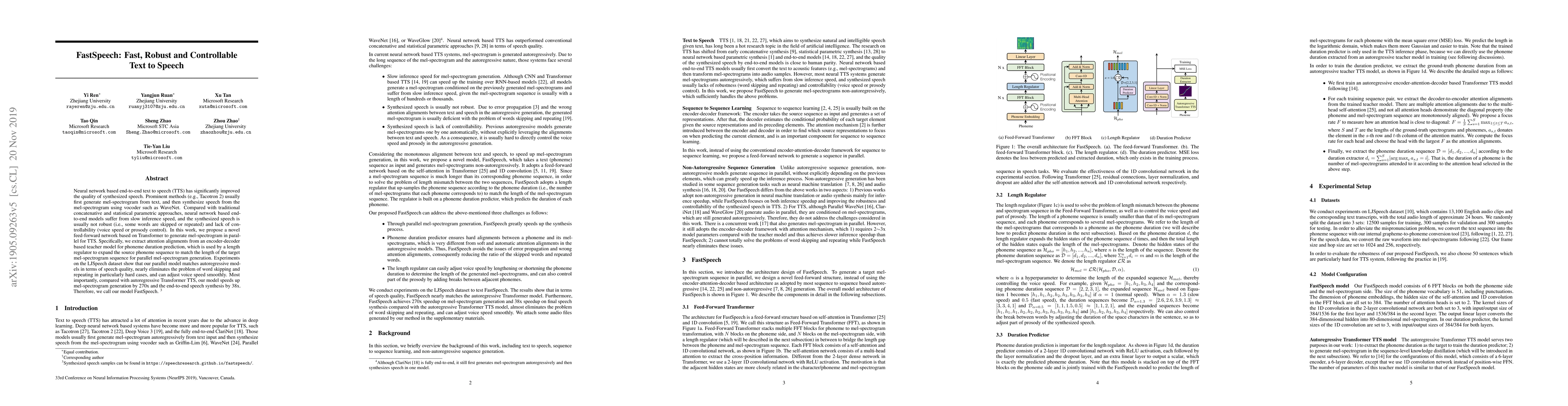 FastSpeech proposes a novel feed-forward Transformer network for fast, parallel mel-spectrogram generation in text-to-speech, significantly speeding up synthesis and improving robustness and controllability over autoregressive models. Experiments demonstrate a 270x faster mel-spectrogram generation and 38x faster end-to-end synthesis while maintaining high speech quality.