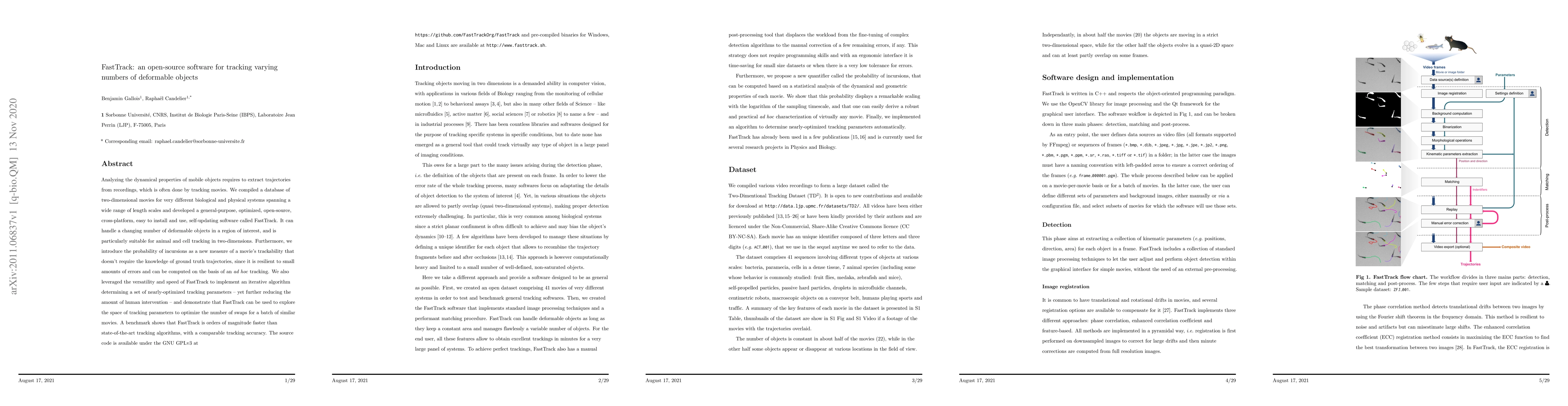Analyzing the dynamical properties of mobile objects requires to extract trajectories from recordings, which is often done by tracking movies. We compiled a database of two-dimensional movies for very different biological and physical systems spanning a wide range of length scales and developed a general-purpose, optimized, open-source, cross-platform, easy to install and use, self-updating software called FastTrack. It can handle a changing number of deformable objects in a region of interest, and is particularly suitable for animal and cell tracking in two-dimensions. Furthermore, we introduce the probability of incursions as a new measure of a movie's trackability that doesn't require the knowledge of ground truth trajectories, since it is resilient to small amounts of errors and can be computed on the basis of an ad hoc tracking. We also leveraged the versatility and speed of FastTrack to implement an iterative algorithm determining a set of nearly-optimized tracking parameters -- yet further reducing the amount of human intervention -- and demonstrate that FastTrack can be used to explore the space of tracking parameters to optimize the number of swaps for a batch of similar movies. A benchmark shows that FastTrack is orders of magnitude faster than state-of-the-art tracking algorithms, with a comparable tracking accuracy. The source code is available under the GNU GPLv3 at https://github.com/FastTrackOrg/FastTrack and pre-compiled binaries for Windows, Mac and Linux are available at http://www.fasttrack.sh.