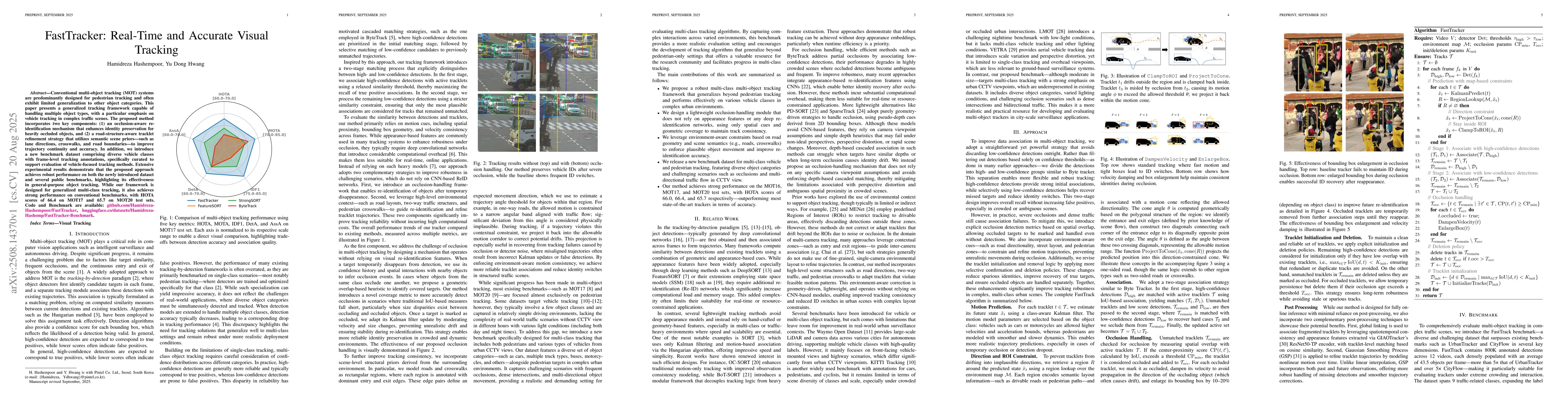 The paper presents FastTracker, a real-time multi-object tracking framework that handles multiple object types, especially vehicles, in complex traffic scenes. It incorporates occlusion-aware re-identification and road-structure-aware tracklet refinement strategies, utilizing semantic scene priors for improved trajectory continuity and accuracy.
