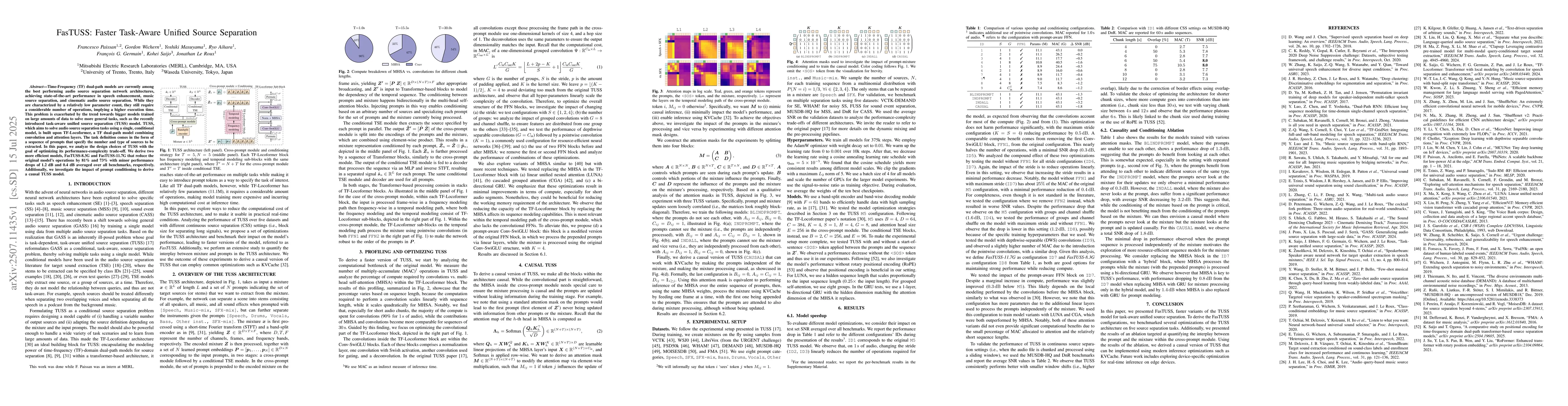 Time-Frequency (TF) dual-path models are currently among the best performing audio source separation network architectures, achieving state-of-the-art performance in speech enhancement, music source separation, and cinematic audio source separation. While they are characterized by a relatively low parameter count, they still require a considerable number of operations, implying a higher execution time. This problem is exacerbated by the trend towards bigger models trained on large amounts of data to solve more general tasks, such as the recently introduced task-aware unified source separation (TUSS) model. TUSS, which aims to solve audio source separation tasks using a single, conditional model, is built upon TF-Locoformer, a TF dual-path model combining convolution and attention layers. The task definition comes in the form of a sequence of prompts that specify the number and type of sources to be extracted. In this paper, we analyze the design choices of TUSS with the goal of optimizing its performance-complexity trade-off. We derive two more efficient models, FasTUSS-8.3G and FasTUSS-11.7G that reduce the original model's operations by 81\% and 73\% with minor performance drops of 1.2~dB and 0.4~dB averaged over all benchmarks, respectively. Additionally, we investigate the impact of prompt conditioning to derive a causal TUSS model.